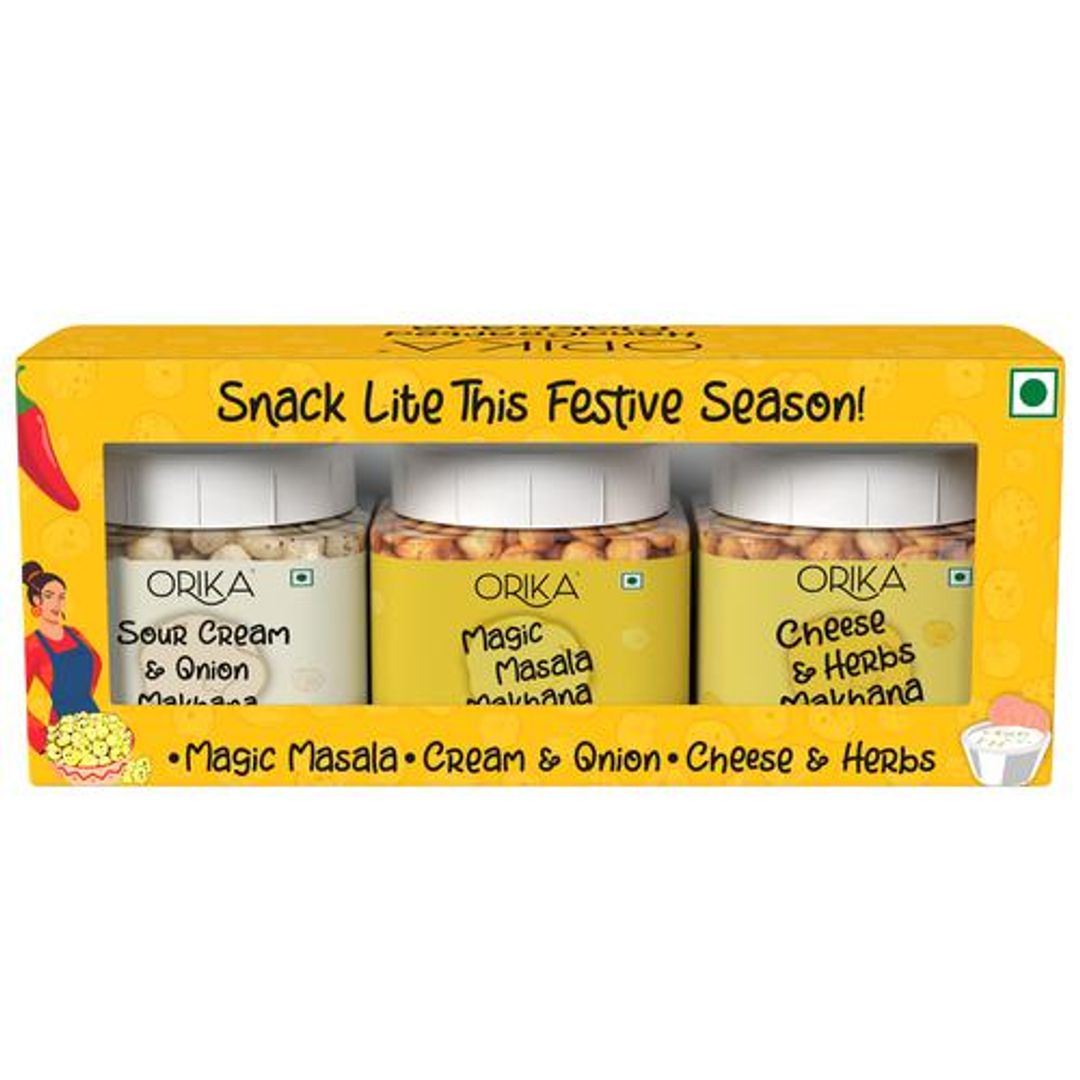 Orika Makhana presents a trio of delectable flavours: Sour Cream & Onion, Cheese & Herbs, and Magic Masala. These premium roasted lotus seeds are carefully seasoned to perfection, offering a delightful snacking experience. Indulge in the creamy and tangy notes of Sour Cream & Onion, savour the rich and savory taste of Cheese & Herbs, and relish the spicy kick of Magic Masala. Orika Makhana is not only delicious but also a healthier snack option, as they are roasted and not fried. With these three enticing flavours, Orika Makhana is sure to satisfy your snack cravings in the most flavourful way.