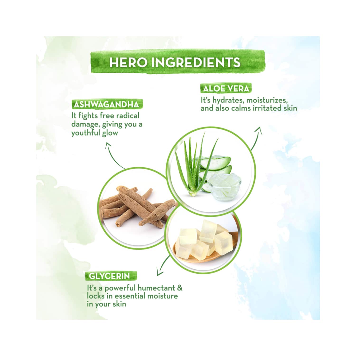 Key Ingredients:Aloe vera: Hydrates, calms, and moisturizes the skinAshwagandha: Fights free radical damage and oxidative stress and adds a youthful glowGlycerin: Locks in essential moisture in the skin
