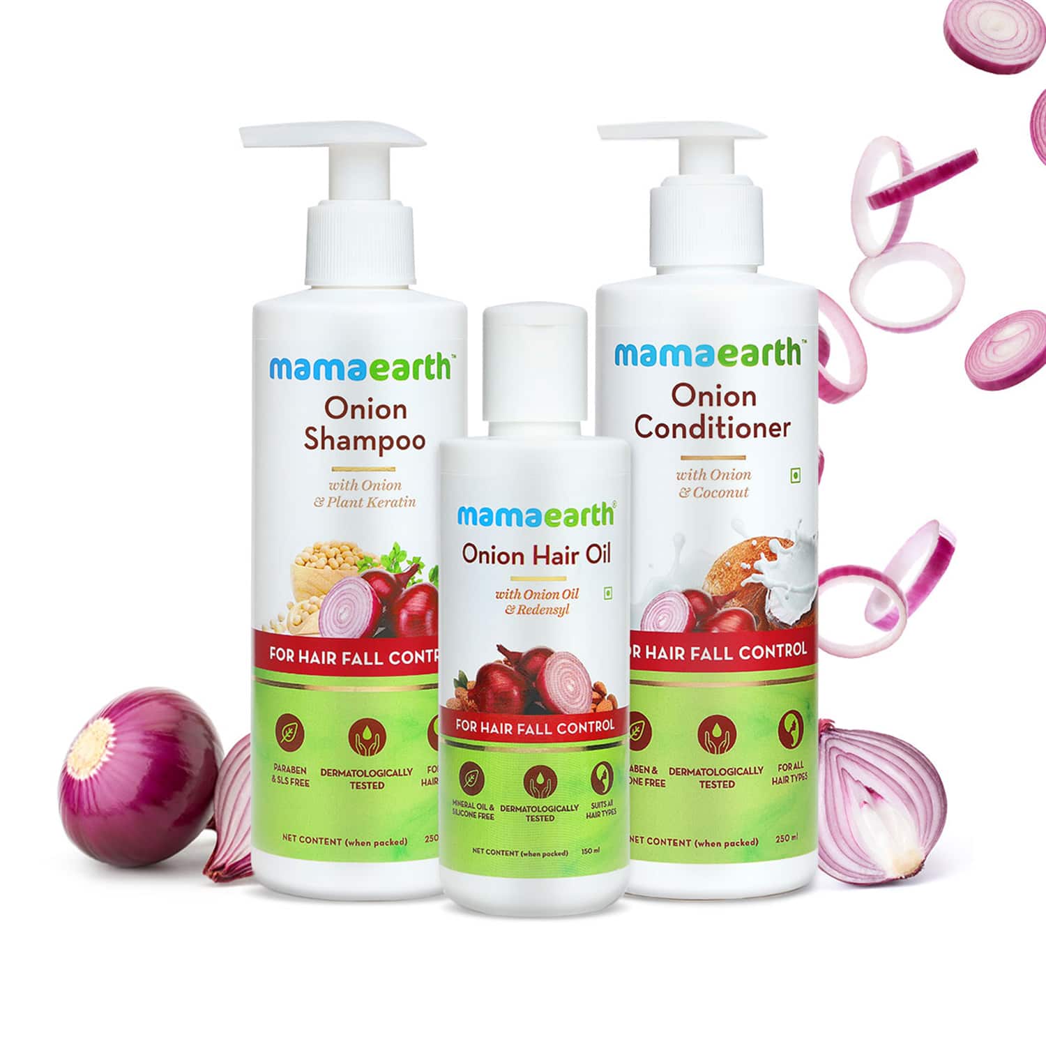 Onion Seed Oil, Coconut, Almond OilMamaearth Onion Hair Oil For Hair Regrowth & Hair Fall Control (150ml)Mamaearth Onion Oil is lightweight and non-sticky formulation and oh-so-good fragrance, it's time to welcome stronger and healthier hair with the time-tested goodness of Onion. Onion Oil, rich in Sulphur, Potassium & antioxidants, reduces hair fall & accelerates hair regrowth. One of the newest breakthrough ingredients in hair growth, Redensyl, unblocks hair follicles & also boosts new hair growth. Safe for colored & chemically treated hair, the Oil is free of harmful chemicals & toxins such as Silicones, Parabens, Mineral Oil, and Dyes.