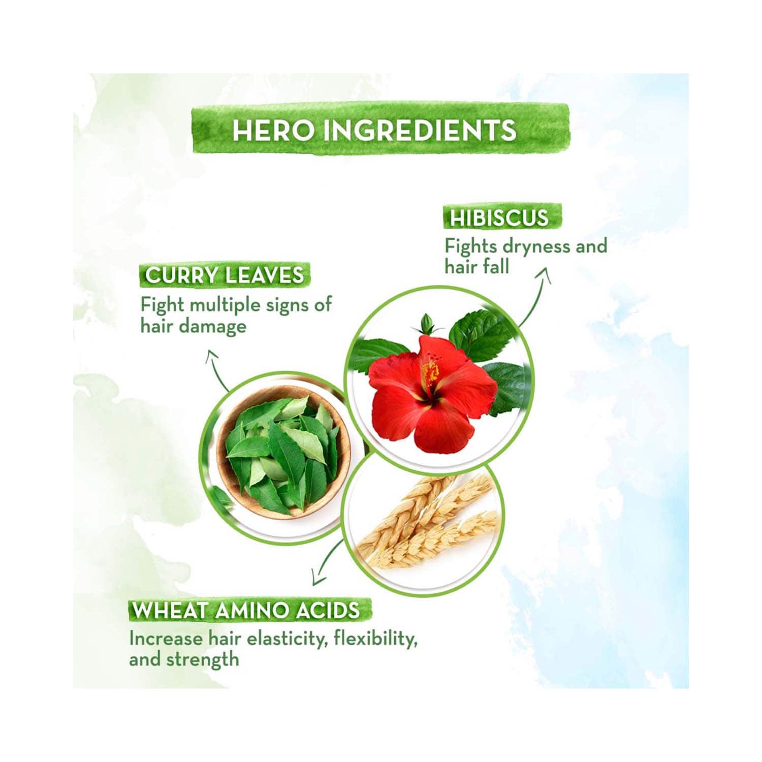 Key Ingredients:Hibiscus: Fights dryness and hair fallCurry leaves: Have vitamin C and fight dullness and frizzWheat amino acids: Increase hair elasticity, flexibility, and strengthSoy amino acids: Strengthen hair cuticles for moisture retention