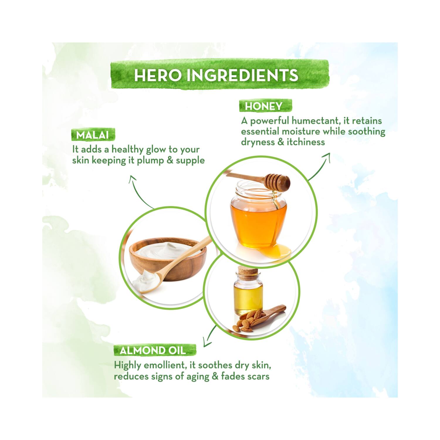 Key Ingredients:Honey, malai, and almond oil: Exfoliate, nourish, and brighten skin