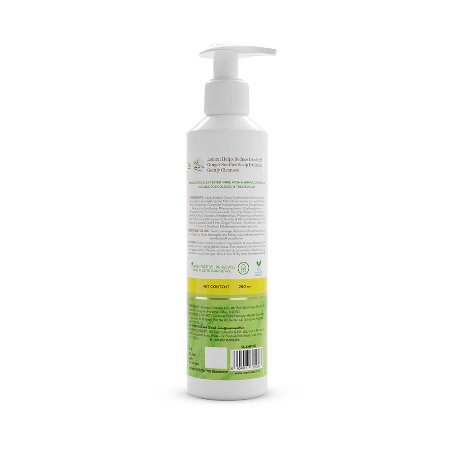 Achieve lovely locks with the Mamaearth Lemon Anti-Dandruff Shampoo (250ml). It contains lemon and ginger oil to soothe dry scalp and reduce dandruff. Also, the Mamaearth shampoo is infused with zinc pyrithione to provide antibacterial and antifungal benefits. Plus, it gently cleanses the scalp to remove dirt and impurities.Key Features & Benefits:Contains coconut oil to keep your hair nourishedInfused with ginger and lemon to soothe dry and itchy scalpConditioning formula leaves your hair soft, smooth, and shinyHelps control dandruff and flakes for healthy-looking hairKey Ingredients:Coconut and almond oils and glycerin: Condition the hairLemon: Reduces dandruff and flakesGinger: Soothes dry and itchy scalpZinc pyrithione: Provides antifungal and antibacterial benefitsAll Ingredients:Aqua, Sodium Cocoyl Isethionate, Sodium Lauroyl Sarcosinate, Capryloyl/Caproyl Methyl Glucamide, Lauroyl/Myristoyl Methyl Glucamide, Cocamide Monoethanolamine, Cocamidopropyl Betaine, Zinc Pyrithione, Phenoxyethanol, Ethylhexylglycerin, Polyquaternium-7, Coco-Glucoside, Glyceryl Oleate, Cetrimonium Chloride, Xylitol, Glucose, Anhydroxylitol, Phoenix Dactylifera Extract, Guar Hydroxypropyltrimonium Chloride, Ifra Certified Allergen Free Fragrance, Capsudx Cool 3 Mp, Ginger Extract, Panthenol, Lemon Fruit Extract, Disodium Ethylenediaminetetraacetate.How to Use:Wet your hair and scalp with water. Pour a small amount of shampoo into your hands and rub them together to create a lather. Massage the shampoo into your scalp, using circular motions, and then work it through the length of your hair. Rinse thoroughly with water.About the Brand:Mamaearth is a personal care brand founded by Ghazal Alagh and Varun Alagh in the year 2016. It is Asia's first brand with Made safe certified products. Their wide range of products includes body care, fragrances, skincare, haircare, cosmetics, and much more. Every product from the brand is made free of harmful ingredients and ensures 100% safe use for kids and parents.Check out more Mamaearth Shampoo options here, or browse through tokocart's full range of Shampoo from top global brands.You can also explore other products from the world of Mamaearth here on tokocart.