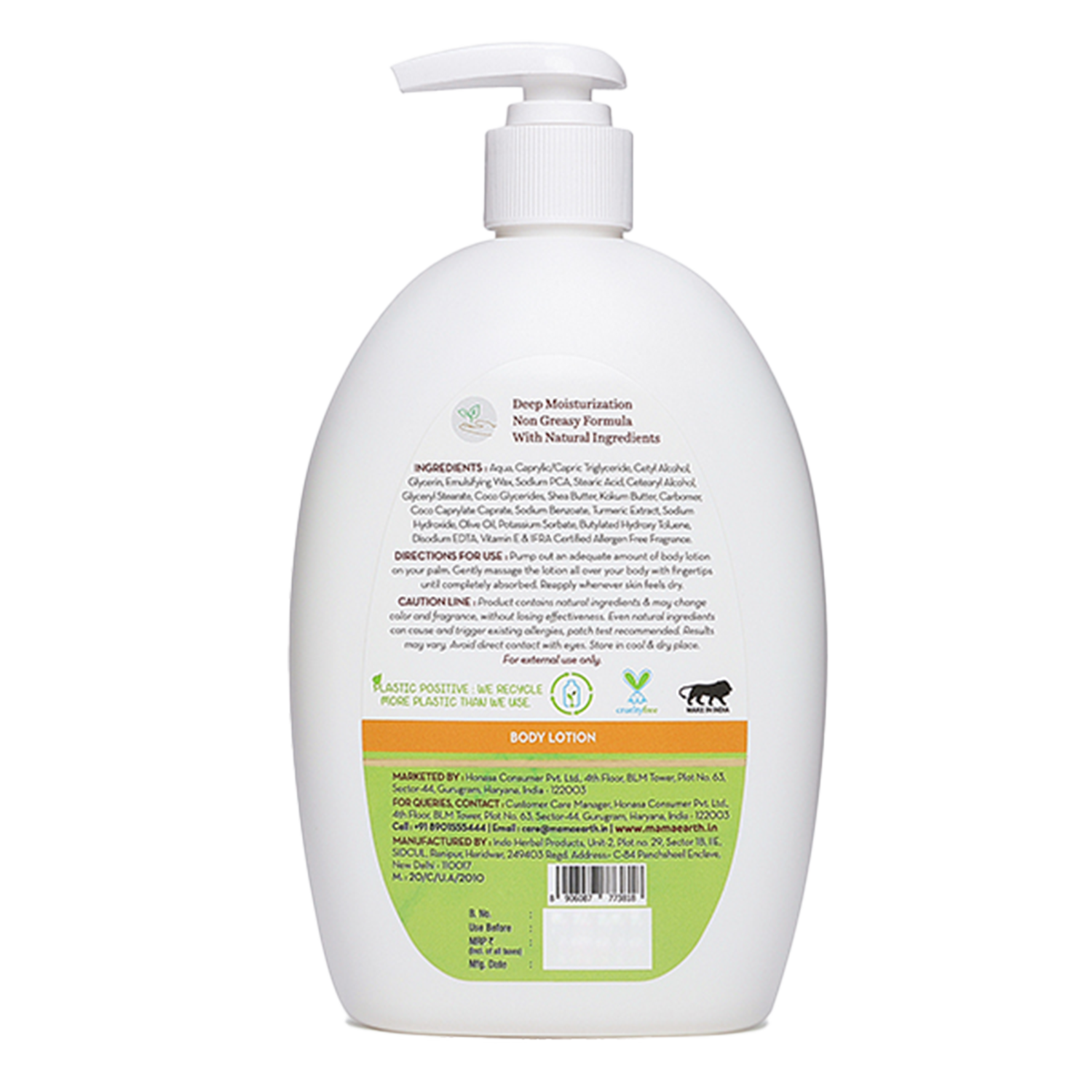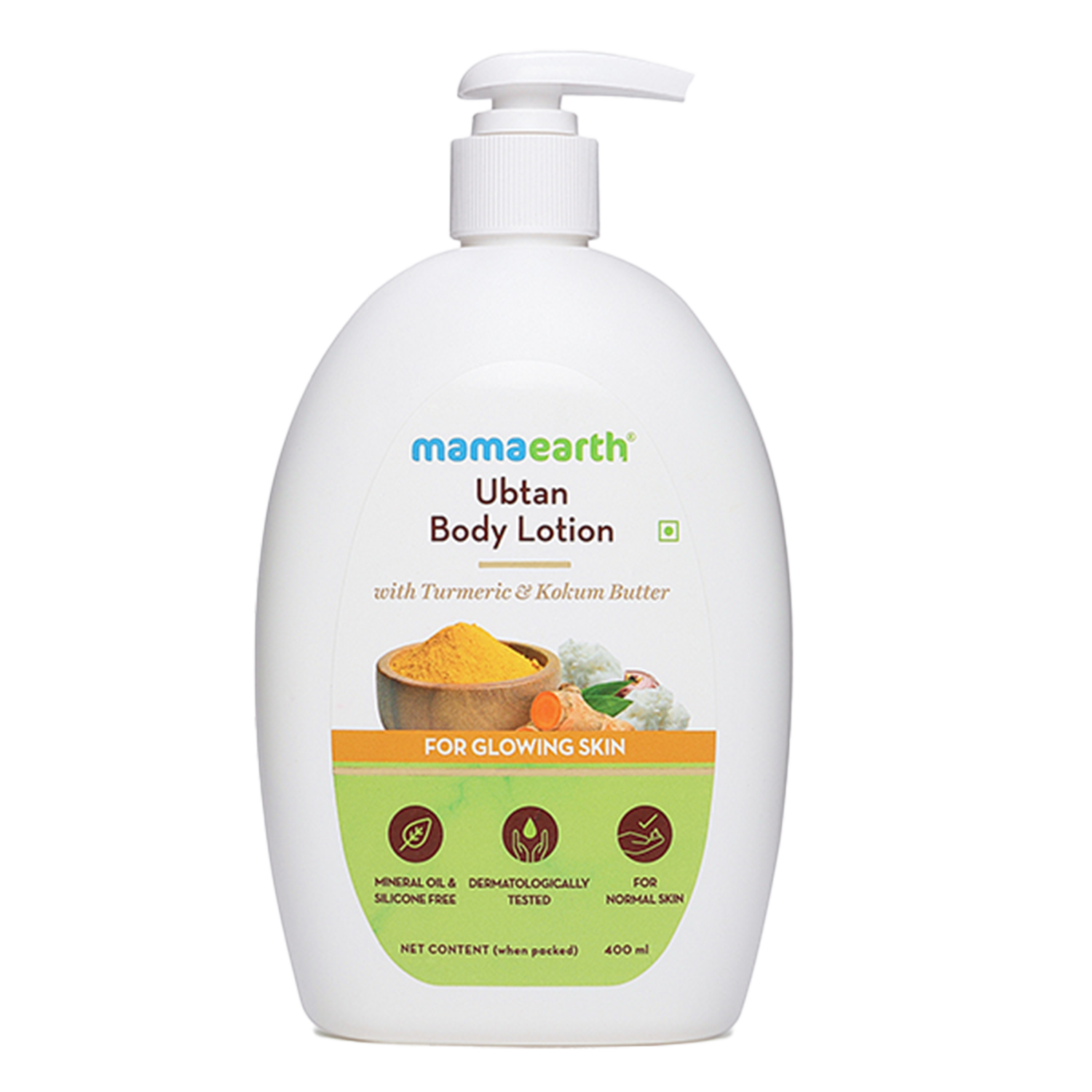 Mamaearth Ubtan Body Lotion is packed with natural and skin-nurturing ingredients like Turmeric, Kokum Butter & Shea Butter that improve the appearance of dull and parched skin. We've got you covered but minus the grease! Mamaearth Ubtan Body Lotion replenishes dry skin without leaving any sticky trail. Skin feels soft & super smooth. The lotion is enriched with the moisturizing goodness of Kokum Butter, Shea Butter & Olive Oil. These natural ingredients improve skin texture and enhance its suppleness while keeping it hydrated for long hours.Key Features & BenefitsRich moisturizationFor glowing skinNon-greasy formulaNatural ingredientsKey IngredientsTurmeric - Provide glow and lustre to the skinOlive Oil - Moisturizes the skin by reducing water lossButter - Helps soften or smoothen dry skinVitamin E - Helps maintain skin elasticity, boosts skin repair and skin toneHow To UsePump out an adequate amount of body lotion on your palm. Gently massage the lotion all over your body until completely absorbed. Reapply whenever skin feels dry.All IngredientsTurmeric, Kokum Butter, Shea ButterAbout the BrandMamaearth was founded in September 2016 by Ghazal Alagh and Varun Alagh, to make skincare routines a little chic but with utmost care. Headquartered in Gurugram (India), Mamaearth is distinguished in the cosmetics industry of India as an online platform that offers natural and toxin-free skin care products.Check out more Mamaearth Body Lotions & Moisturisers options here, or browse through tokocart's full range of Body Lotions & Moisturisers from top global brands.You can also explore other products from the world of Mamaearth here on tokocart.