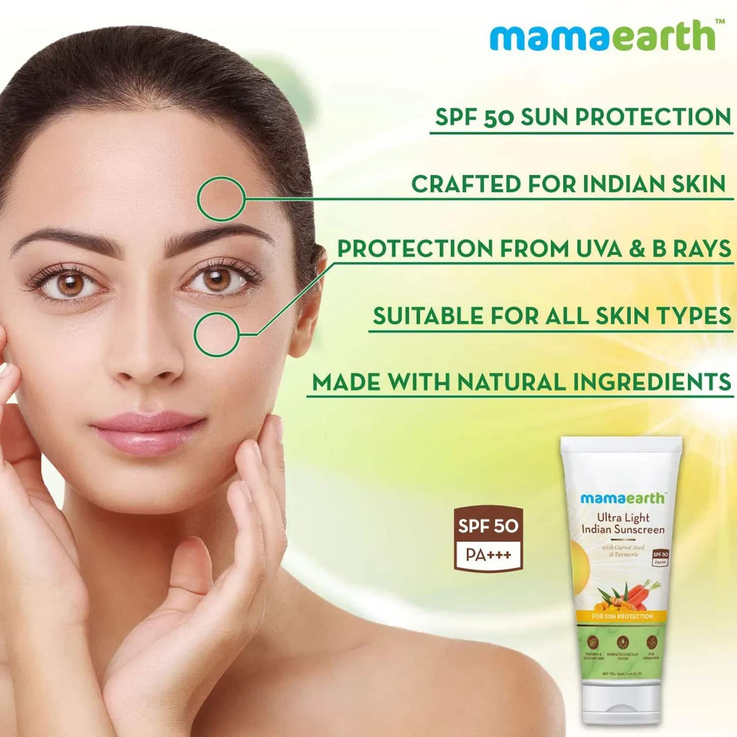 Mamaearth Ultra Light Indian Sunscreen is power-packed with Carrot Seed Oil, Turmeric, and Orange Oil – it has SPF 50 with PA+++ protection to help safeguard your skin even in the harshest Indian summers. Super lightweight, it doesn't dry out or leave patches, keeping your skin moisturized & protected for an extended period. It protects against the sun, reduces tan, and keeps your skin glowing! Suitable for all skin types, Mamaearth Ultra Light Indian Sunscreen is free of Silicones, Sulfates, Phthalates, Parabens, and artificial colors.Key Features & BenefitsNatural and organic ingredient based sunscreenDeeply nourishing formulaNatural fragranceNo harmful chemicalsHypo-allergenicKey IngredientsTurmeric - Provide glow and lustre to the skinOrange Oil - Acts as a natural cleanser to deeply purify and detoxify the skinHow To UseTake a pea-sized amount of sunscreen on your fingertip. Apply dots all over face & neck and massage in a circular motion. Massage till the cream is completely absorbed.All IngredientsCarrot Seed Oil, Turmeric, Orange OilAbout the BrandMamaearth was founded in September 2016 by Ghazal Alagh and Varun Alagh, to make skincare routines a little chic but with utmost care. Headquartered in Gurugram (India), Mamaearth is distinguished in the cosmetics industry of India as an online platform that offers natural and toxin-free skin care products.