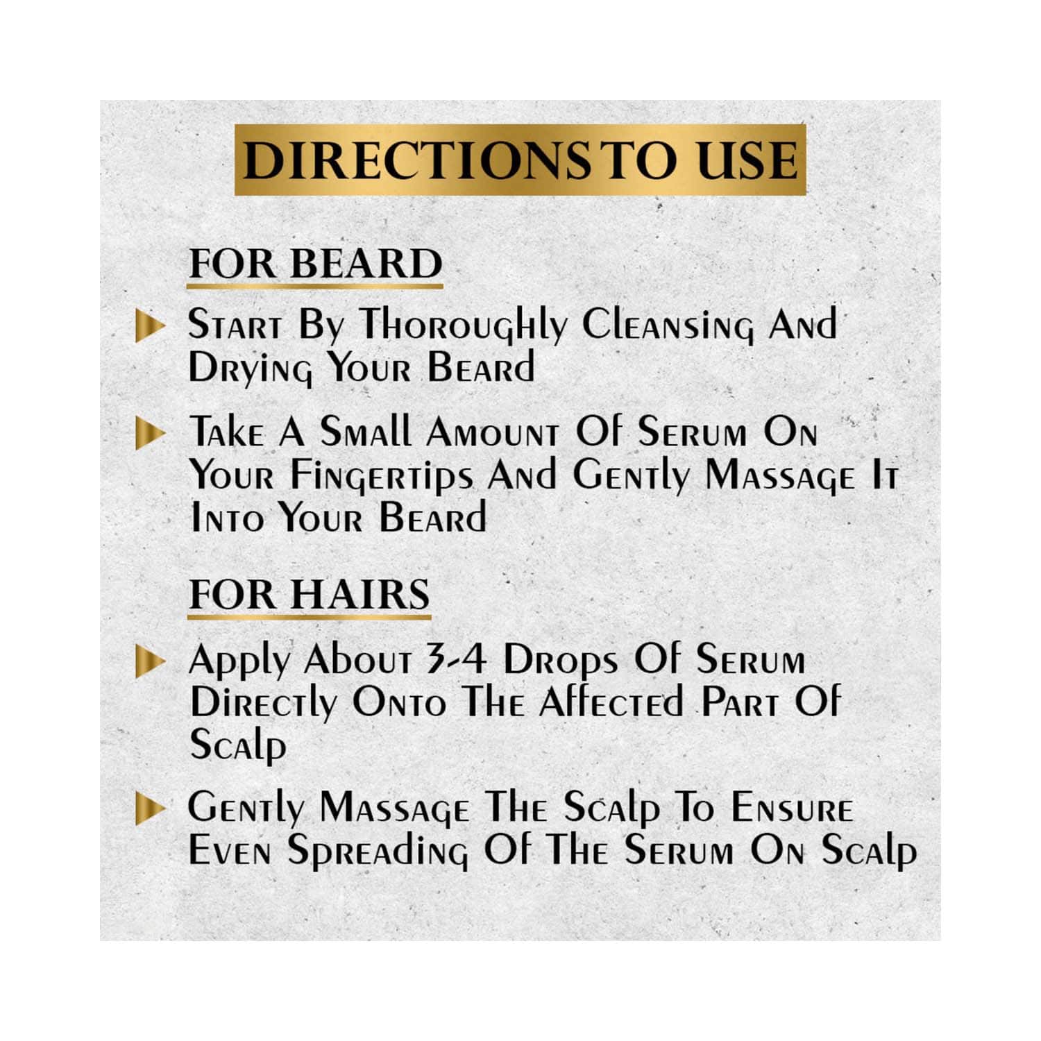 How to Use:Cleanse and dry your beard. Take a small amount of the serum and massage it into your beard. For your hair, take 3-4 drops of the serum and apply it to the affected area of the scalp. Massage the serum onto the scalp to ensure even distribution of the product.