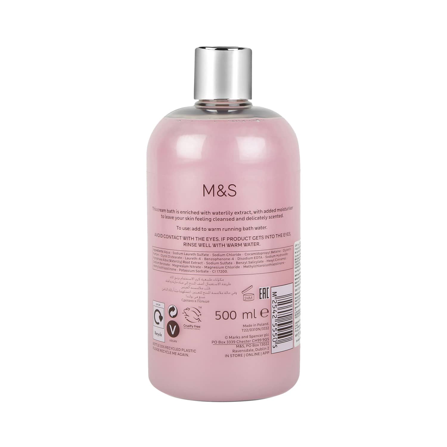 Upgrade your bath routine with the Marks & Spencer Water Lily Bath Cream (500ml). This conditioning bath cream cleanses your skin, leaving your skin feeling silky and rejuvenated. Also, the Marks & Spencer bath cream contains Water Lily extract to exude a floral scent and soothe your senses.Key Features & Benefits:Infused with Water Lily extract to exude a pleasant scentCleanses the skin to remove dirt and impuritiesIdeal for softening the skin and leaving it feeling silky and rejuvenatedCruelty-free and vegan for sustainable useKey Ingredients:Water Lily extract: Exudes a pleasant scentAll Ingredients:Aqua, Sodium Laureth Sulfate, Sodium Chloride, Cocamidopropyl Betaine, Glycerin, Parfum, Glycol Distearate, Laureth-4, Benzophenone-4, Disodium Edta, Sodium Hydroxide, Nymphaea Alba (Water Lily) Root Extract, Sodium Sulfate, Benzyl Salicylate, Hexyl Cinnamal, Sodium Benzoate, Magnesium Nitrate, Magnesium Chloride, Methylchloroisothiazolinone, Methylisothiazolinone, Potassium Sorbate, Ci 17200How to Use:To use bath cream, start by wetting your whole body with water. Then, squirt some bath cream into your hand (about the size of a quarter). Massage the bath cream into your skin and let it sit for 30 seconds. Clean off with water and pat dry with a towel.About the Brand:Established in the year 1884, Marks & Spencer is a British brand that offers fashion, beauty, food products, and home appliances to meet the needs of thousands of customers all around the world. The brand manufactures a wide range of beauty products, from moisturisers to body washes and so much more. With its rich heritage and strong brand values, Marks & Spencer has set up a network of 1, 487 stores and 98 websites globally. All the products of the brand are cruelty-free and ensure safe use.Check out more Marks & Spencer Body Wash & Shower Gel options here, or browse through tokocart's full range of Body Wash & Shower Gel from top global brands.You can also explore other products from the world of Marks & Spencer here on tokocart.