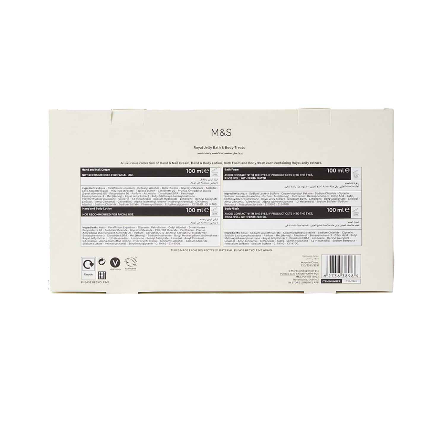 Gift your skin ultimate nourishment with the Marks & Spencer Luxury Body Treats Gift Set - (4 Pcs). This skin care kit contains a body wash, cleansing body foam, nourishing hand and body lotion, and hand and nail cream for healthy skin. It is a moisturizing kit that protects the moisture mantle of your skin. The Marks and Spencer body care kit is also a smoothening kit that improves skin texture.