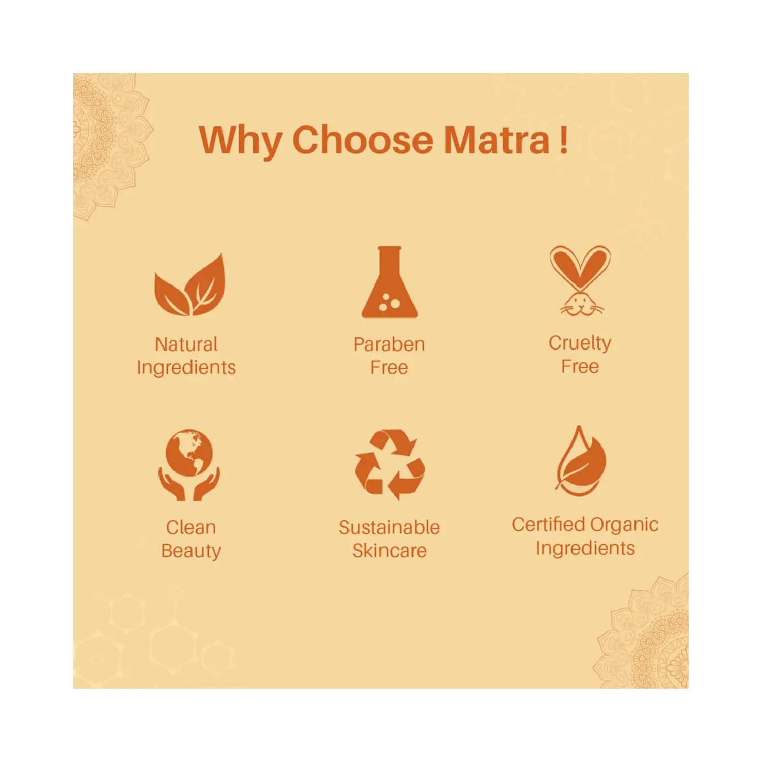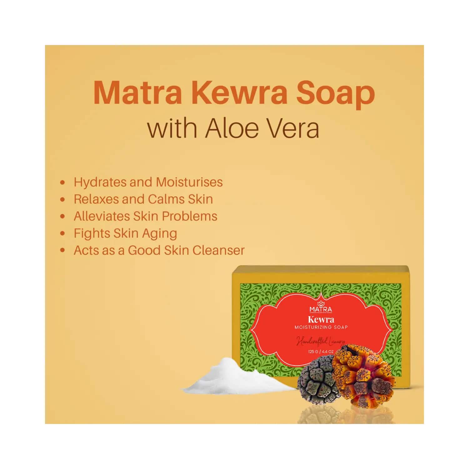 Enhance your everyday bath routine with the Matra Kewra Natural Handmade Soap (125g). It is infused with kewra, aloe vera, and coconut oil to effectively rejuvenate your skin from within. This moisturizing soap bar instantly hydrates your skin while removing dirt, grime, and impurities. This Matra soap also offers a cooling sensation, so your skin feels relaxed after every shower.Key Features & Benefits:Enriched with kewra, aloe vera, and coconut oilFreshens, nourishes, and hydrates skin from withinExfoliates and cleanses dirt, oil, and pollutionSuitable for all skin typesKey Ingredients:Kewra: Cleanses skinCoconut oil: Moisturizes skinAloe vera: Soothes skinHow to Use:Dampen your skin. Then use water to wet the soap and rub it gently over your body to create a lather. Shortly after, rinse it off with water and towel dry your body to get fresh and scented skin.All Ingredients:Kewra, Aloe Vera, Coconut OilAbout the Brand:Founded by Gunjan Arora, Matra is a sustainable skin care brand based in India. This brand crafts the finest quality products, combining Ayurveda's rich history and modern science. This luxurious skin care brand currently has a wide range of serums, moisturizers, face packs, cleansers, makeup sponges, and more. Moreover, the brand refrains from testing its products on animals.Check out more Matra Soaps options here, or browse through tokocart's full range of Soaps from top global brands.You can also explore other products from the world of Matra here on tokocart.