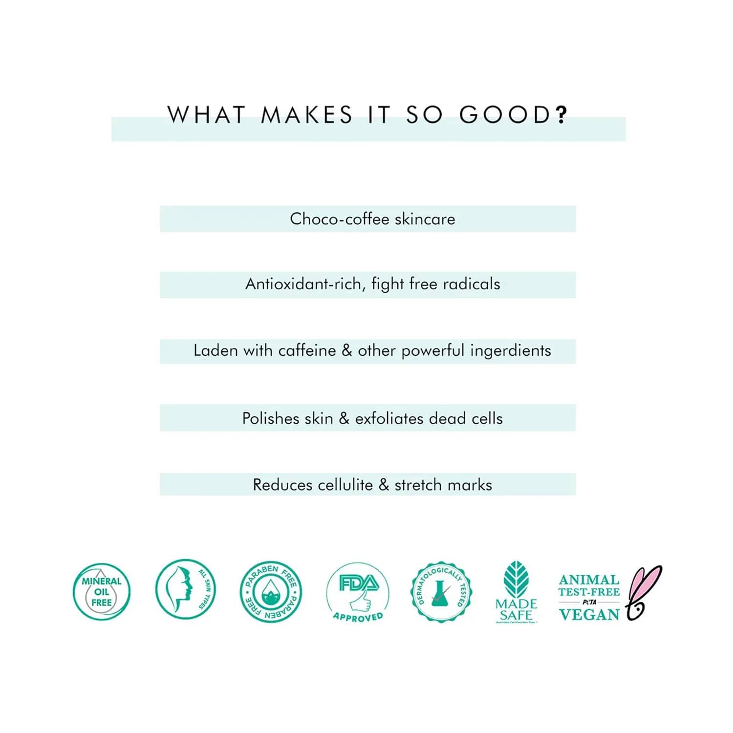 Flaunt your skin with confidence and boldness with the help of the mCaffeine Body Polishing Kit - (2 Pcs.) It consists of Naked and Raw Coffee Body Scrub and Naked and Rich Choco Body Butter that bring freshness and radiance to the skin. The mCaffeine body polishing kit has a chocolatey coffee aroma with inherent qualities to exfoliate and nourish the skin around the clock. Infused with skin-friendly ingredients like pure arabica coffee, caffeine, coconut oil, cocoa butter, caramel, argan oil, vitamin e, and glycerine, this body polishing kit ensures that the skin is soft and supple. In addition, it is an FDA-approved and PETA-certified cruelty-free body care kit to ensure safe use on the skin.Key Features & Benefits:Enriched with natural ingredients to make the skin healthy and hydratedBrings freshness and radiance by exfoliating and nourishing the skinMade safe body polishing kit cleanses and elevates the dull and tired skinReduces scars and relieves stretch marks from the bodyFormulated to suit all skin tonesDermatologically tested body polishing kit for safe use on skinKey Ingredients:Pure Arabica CoffeeExfoliates and removes tan and dark spots from the skinCaffeineTones the skin and reduces cellulite by fighting free radicalsCoconut Oil and vitamin ESoftens and nourishes the skinCocoa Butter and glycerineMoisturises and hydrates the skinCaramelImproves the skin texture by reducing scars and relieving stretch marksArgan OilPolishes the skin and makes it glowyHow to Use:Start by applying the Naked and Raw Coffee Body Scrub on a wet body and spread it all around gently in a circular motion for a couple of minutes for exfoliating purposes. Now take warm water, rinse well and pat dry the body. The main focus for body scrubbing should be on the shoulders, knees, elbows, and neck area. Follow it up by applying the Naked and Rich Choco Body Butter to care for open pores and moisturise the body. It is vital to massage the body butter in a gentle way so that the body absorbs it fully. Once done, the skin will become shiny and smooth, exuding a chocolatey coffee aroma.All Ingredients:Coffee Body Scrub: Pure Arabica Coffee, Caffeine, Coconut Oil.Choco Body Butter: Cocoa Butter, Caramel, Argan Oil, Vitamin E, Caffeine, Glycerine.About the Brand:Launched in 2015, mCaffeine is a personal care brand with a wide range of caffeinated products. Its products are made using FDA-approved ingredients, free from SLS and parabens, and dermatologically tested for safe use. Each product is created with the goodness of caffeine and other active ingredients for the best results. mCaffeine focuses on redefining the age-old notions of beauty and helping everyone feel confident in their own skin.Check out more mCaffeine Body Scrubs & Exfoliants options here, or browse through tokocart's full range of Body Scrubs & Exfoliants from top global brands.You can also explore other products from the world of mCaffeine here on tokocart.