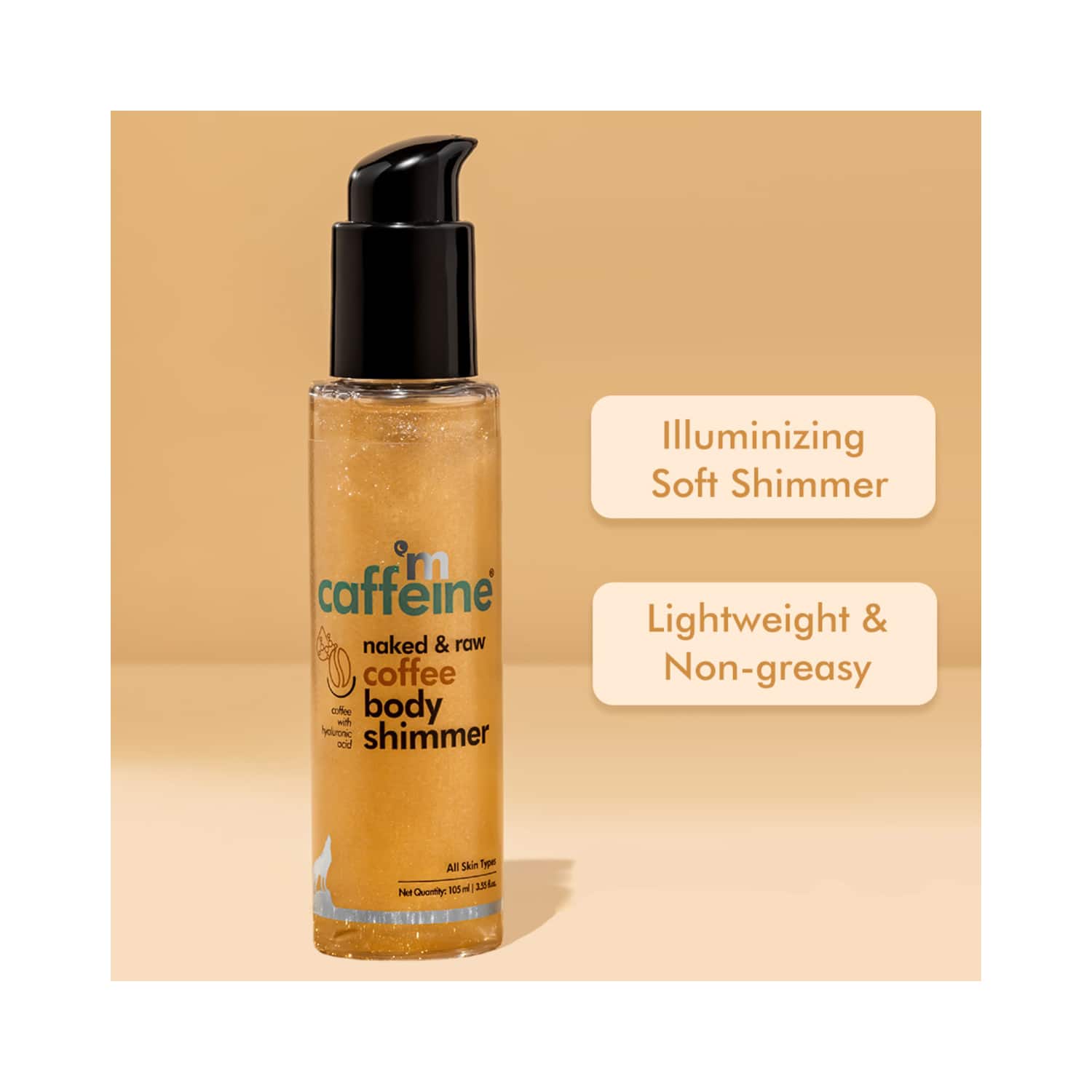 Get a natural glowing face with the Mcaffeine Coffee Body Shimmer (105ml). This coffee body shimmer keeps your skin hydrated for 24 hours. It is a lightweight shimmer that gets easily absorbed into the skin and provides a shiny finish. The MCaffeine body shimmer is also a skin-brightening shimmer that offers radiant skin.Key Features & Benefits:Infused with caffeine to soothe the skinLong-lasting shimmer keeps skin hydrated for 24 hoursNon-greasy formula for fast absorptionFree from SLS for safe useKey Ingredients:Coffee: Tones the skinHyaluronic acid: Hydrates the skinHow to Use:Apply the body shimmer all over the body. Then, leave it to dry.About the Brand:Vikas Lachhwani and Tarun Sharma founded Mcaffeine in 2015. MCaffeine is a personal care brand that offers caffeine-infused face, body, and hair care products. They believe in all skin and body prejudices. It redefines age-old notions of beauty associated with a color and never sells anxiety. Its personal care product portfolio includes shampoos, facial cleansers, shower gels, body lotions, and face masks, with caffeine as the primary ingredient. They are India's premier caffeine personal care brand with an exciting range of caffeine products for aspiring young millennials. Mcaffeine is a 100% vegan, cruelty-free and PETA-approved brand.Check out more mCaffeine Body Lotions & Moisturisers options here, or browse through tokocart's full range of Body Lotions & Moisturisers from top global brands.You can also explore other products from the world of mCaffeine here on tokocart.