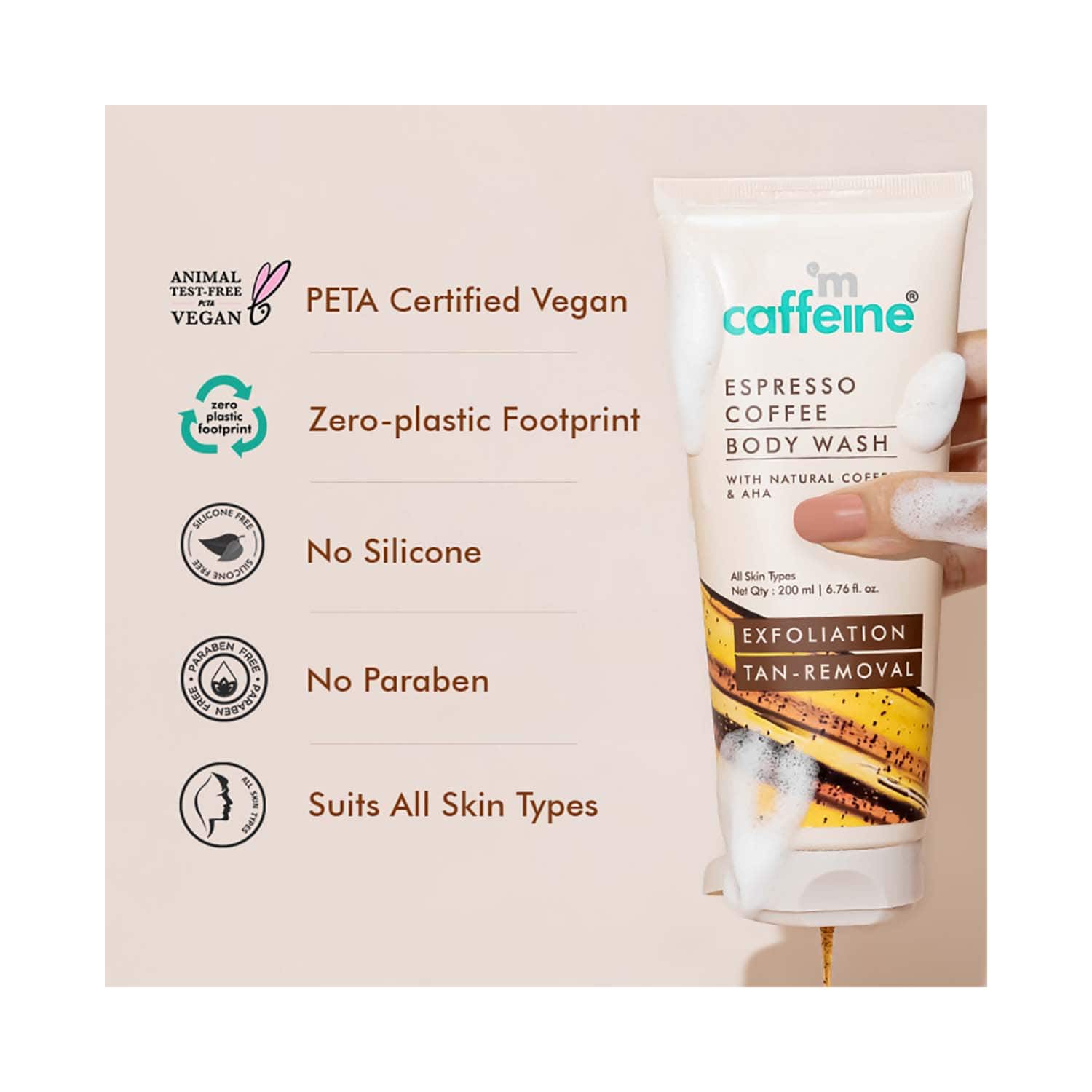 Revel in the afterglow of the mCaffeine Espresso Body Wash Tube (200ml). Made with coffee, this exfoliating body wash scrubs off dead skin cells and smoothens your skin texture. As a detan body wash, it reveals even-toned, glowing skin while leaving you with the fragrance of pure Arabica coffee. Crafted with a dermatologically tested vegan formulation, this mCaffeine body wash ensures safe use.Key Features & Benefits:Made with coffee to scrub off dead skin cells and smoothen the skin textureReveals even-toned, glowing skin by reducing tanScents the skin with the rich fragrance of pure Arabica coffeeDermatologically tested vegan formulation ensures safe useKey Ingredients:Coffee: Exfoliates the skin and reduces tanAHA: Evens out the skin texture and improves the complexionAll Ingredients:Coffee & Caffeine, Coffee Oil, Natural AhaHow to Use:Take a small amount of the body wash into your palm or a loofah. Apply it all over your body, then gently massage it over your skin, working up a lather. Rinse the body wash off thoroughly and pat your skin dry with a soft towel.About the Brand:Vikas Lachhwani and Tarun Sharma founded mCaffeine in 2015. mCaffeine is a personal care brand with face, body, and hair care products. It redefines age-old notions of beauty and disregards any preoccupation with skin color. Its personal care product portfolio includes shampoos, facial cleansers, shower gels, body lotions, and face masks, all infused with caffeine as the primary ingredient. mCaffeine fulfills its duty towards its customers and the planet, ensuring that its formulations are 100% vegan, cruelty-free, and PETA-approved.Check out more mCaffeine Body Wash & Shower Gel options here, or browse through tokocart's full range of Body Wash & Shower Gel from top global brands.You can also explore other products from the world of mCaffeine here on tokocart.