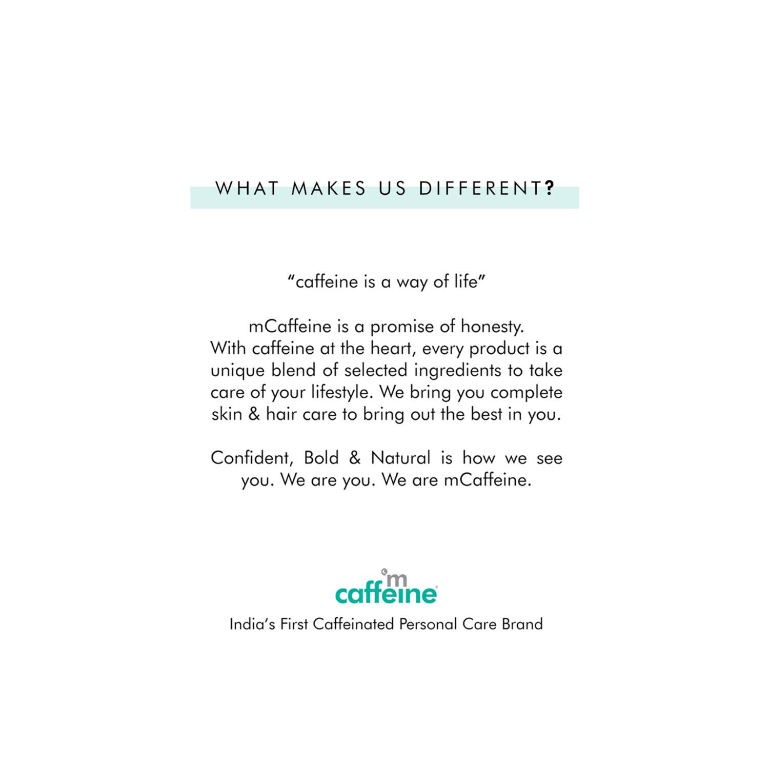 About the Brand:Vikas Lachhwani and Tarun Sharma founded Mcaffeine in 2015. MCaffeine is a personal care brand that offers caffeine-infused face, body, and hair care products. They believe in all skin and body prejudices. It redefines age-old notions of beauty associated with a color and never sells anxiety. Its personal care product portfolio includes shampoos, facial cleansers, shower gels, body lotions, and face masks, with caffeine as the primary ingredient. They are India's premier caffeine personal care brand with an exciting range of caffeine products for aspiring young millennials. Mcaffeine is a 100% vegan, cruelty-free and PETA-approved brand.