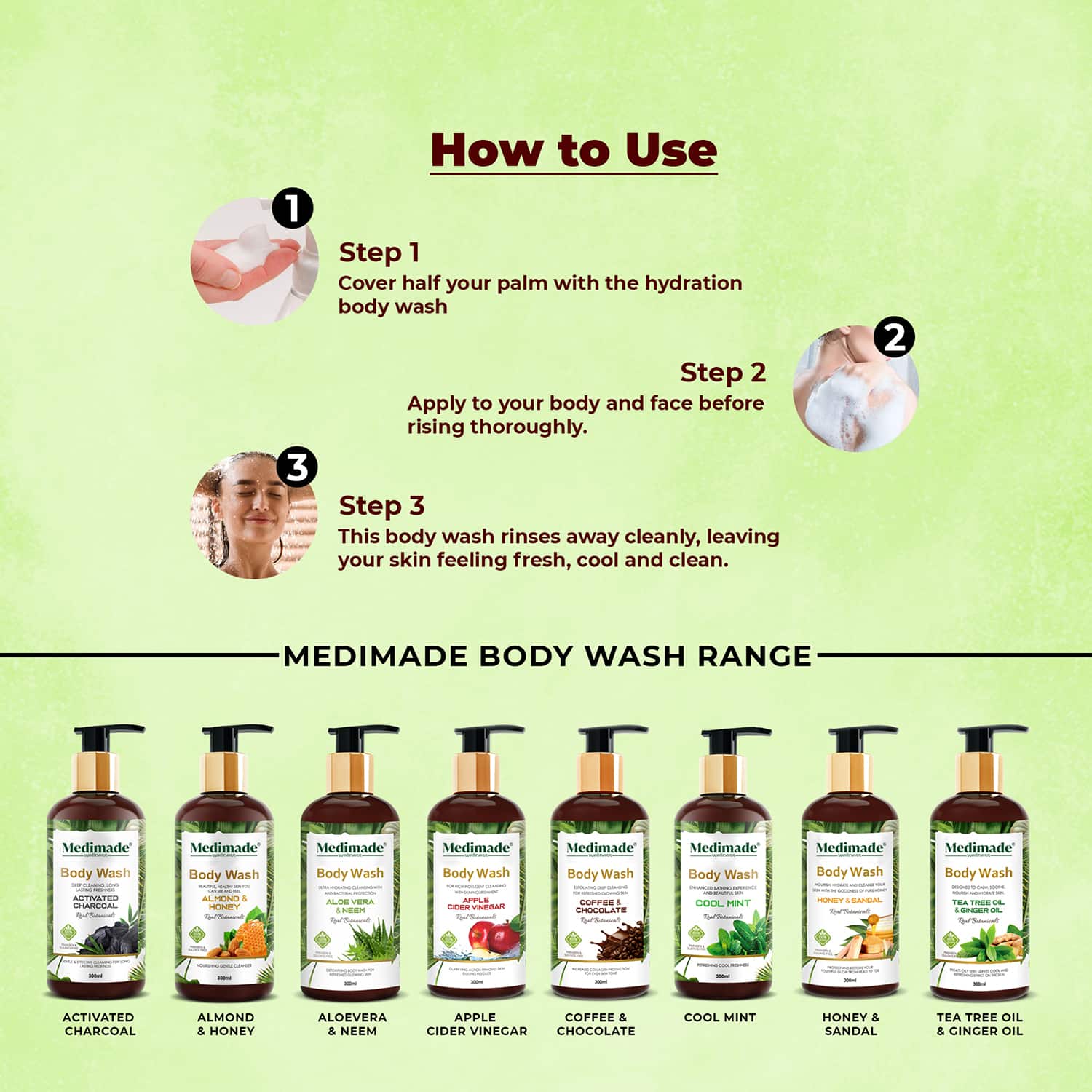 Awaken your skin and senses with the Medimade Aloe Vera & Neem Body Wash (300ml). This natural cleanser brings a glow to your skin and calms your mind with its aromatic bliss. In addition, the Medimade body wash purifies and gently cleanses your skin without stripping it of its natural oils.Key Features & Benefits:Infused with aloe vera to give you refreshed and glowing skinNeem helps soothe irritationDeep cleansing body wash to rid the body of all the dirt and dustCruelty-free body wash for safe and sustainable useKey Ingredients:Aloe vera: Soothes skinNeem: Reduces early signs of ageingShea butter and vitamin E: Moisturize skinHow to Use:To start, pour the body wash on a wet loofah. After that, squeeze the loofah to create a lather and massage it on your damp skin. Then, rinse off the body wash with water and towel dry your body to get soft and fragrant skin.About the Brand:Medimade is an Indian-based beauty and wellness brand. They offer a wide variety of products, ranging from pet care, haircare, skincare, body care, and nutrition and health products, made using natural and ethically sourced ingredients. The brand aims to provide affordable and high-quality products that can be used by all genders, age groups, and strata of society. Medimade maintains strict multi-level quality checks to ensure the products are effective and safe for use. All products are chemical-free and crafted using environment-friendly processes.Check out more Medimade Body Wash & Shower Gel options here, or browse through tokocart's full range of Body Wash & Shower Gel from top global brands.You can also explore other products from the world of Medimade here on tokocart.