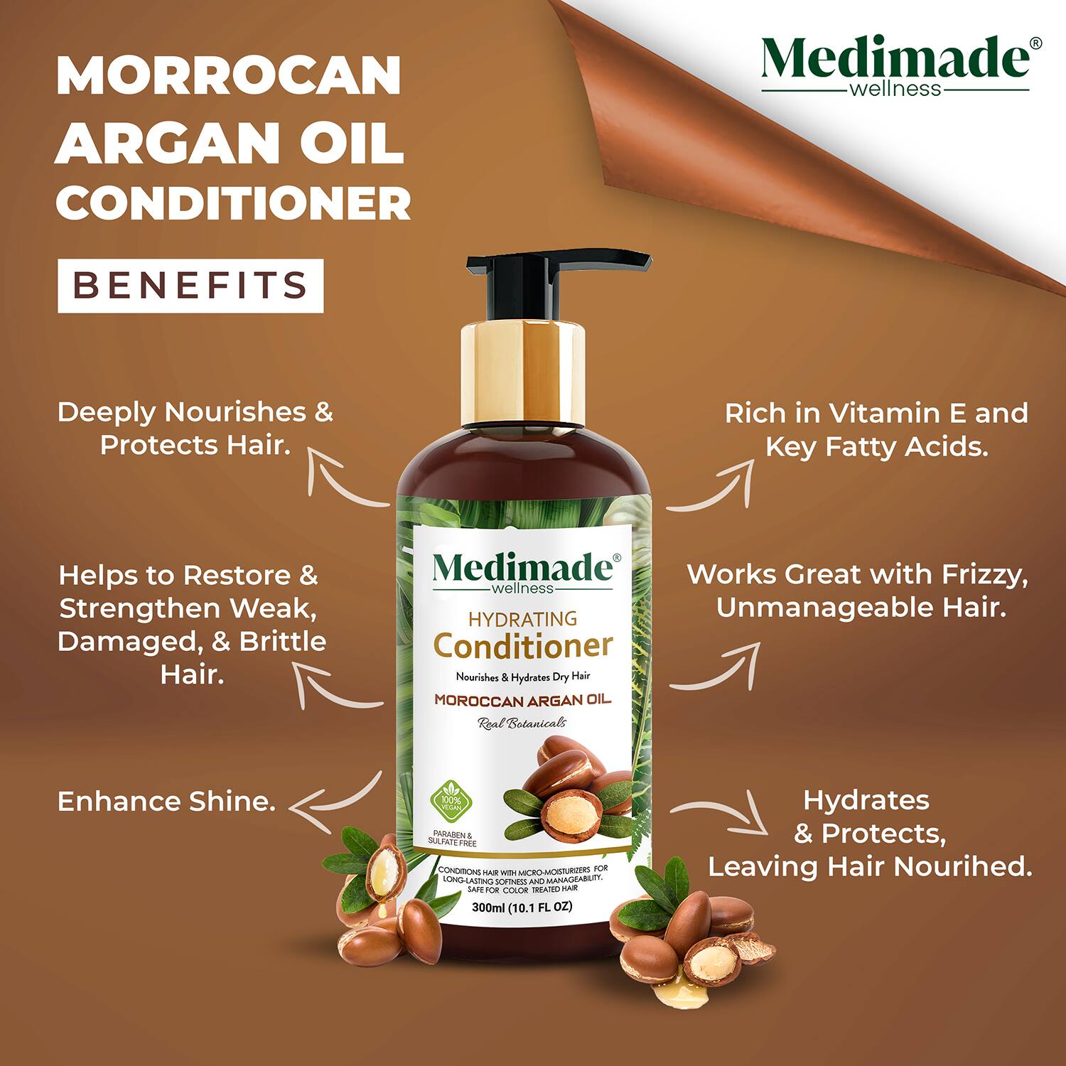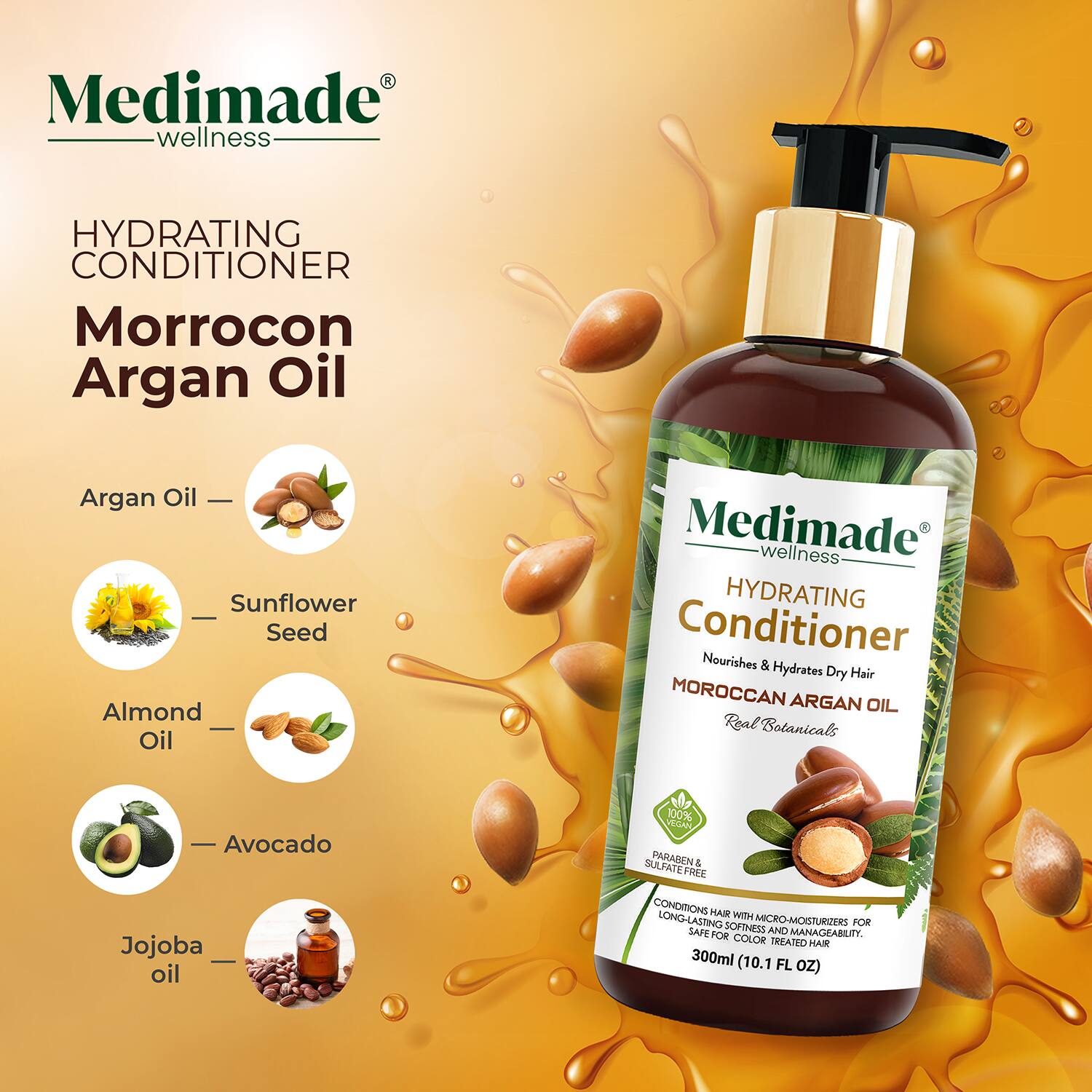 Go for healthy-looking hair with the Medimade Moroccan Argan Oil Hydrating Conditioner (300ml). It helps to protect your hair from UV damage and heat caused by styling. This Medimade hair conditioner is infused with Moroccan argan oil and other natural oils to restore shine and heal damaged dry hair. The hair conditioner also helps to strengthen your hair and provide a soft look. A cruelty-free hair conditioner, it is made free of harmful chemicals and is reliable for safe use on your hair.Key Features & Benefits:Infused with Moroccan argan oil and other natural oils to heal and restore shine to damaged dry hairProtects your hair from styling heat and UV damageHelps to soften and strengthen hairCruelty-free formulation for reliable useKey Ingredients:Argan oil: Moisturizes hair and scalpJojoba oil: Controls frizzAlmond oil: Strengthens hairHow to Use:Shampoo your hair and rinse off well. Apply a small amount of conditioner to your scalp and hair strands. Leave it for 1 minute and rinse well for softer and bouncier hair.About the Brand:Medimade is an Indian-based beauty and wellness brand. They offer a wide variety of products, ranging from pet care, haircare, skincare, body care, and nutrition and health products, made using natural and ethically sourced ingredients. The brand aims to provide affordable and high-quality products that can be used by all genders, age groups, and strata of society. Medimade maintains strict multi-level quality checks to ensure the products are effective and safe for use. All products are chemical-free and crafted using environment-friendly processes.