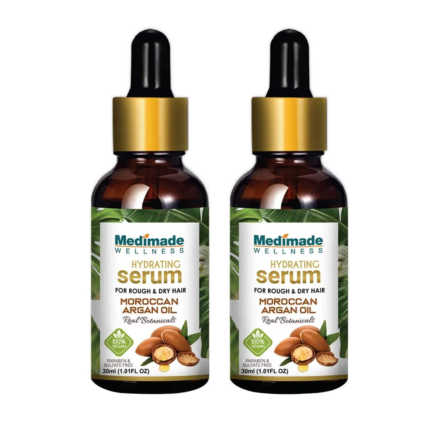 Enjoy a healthy hair look with the Medimade Moroccan Argan Oil Hydrating Serum - (2 Pcs). It is a pack of two serums that help to condition your hair and adds life to it. This Medimade hydrating serum pack is infused with Moroccan argan oil, castor oil, olive oil, and vitamin E to provide strong and shiny hair. The hair serums also prevent frizz and split ends in the hair. These cruelty-free hair serums are made free of harmful chemicals and are reliable for safe use on your hair.Key Features & Benefits:Pack of two serums infused with Moroccan argan oil, castor oil, olive oil, and vitamin E that make hair strong and shinyPrevents frizz and split ends in the hairHelps to condition hair for a healthy lookCruelty-free formulation for reliable useKey Ingredients:Argan oil: Moisturizes hair and scalpOlive oil: Reduces hair breakageAlmond oil: Strengthens hairVitamin E: Supports healthy scalpHow to Use:Pump out a desirable amount of serum into your palm. Apply and massage gently onto the scalp and then from the roots along the length of the hair. Leave it to rest for at least half an hour and rinse with shampoo. Use it overnight for better results.About the Brand:Medimade is an Indian-based beauty and wellness brand. They offer a wide variety of products, ranging from pet care, haircare, skincare, body care, and nutrition and health products, made using natural and ethically sourced ingredients. The brand aims to provide affordable and high-quality products that can be used by all genders, age groups, and strata of society. Medimade maintains strict multi-level quality checks to ensure the products are effective and safe for use. All products are chemical-free and crafted using environment-friendly processes.Check out more Medimade Hair Serum options here, or browse through tokocart's full range of Hair Serum from top global brands.You can also explore other products from the world of Medimade here on tokocart.
