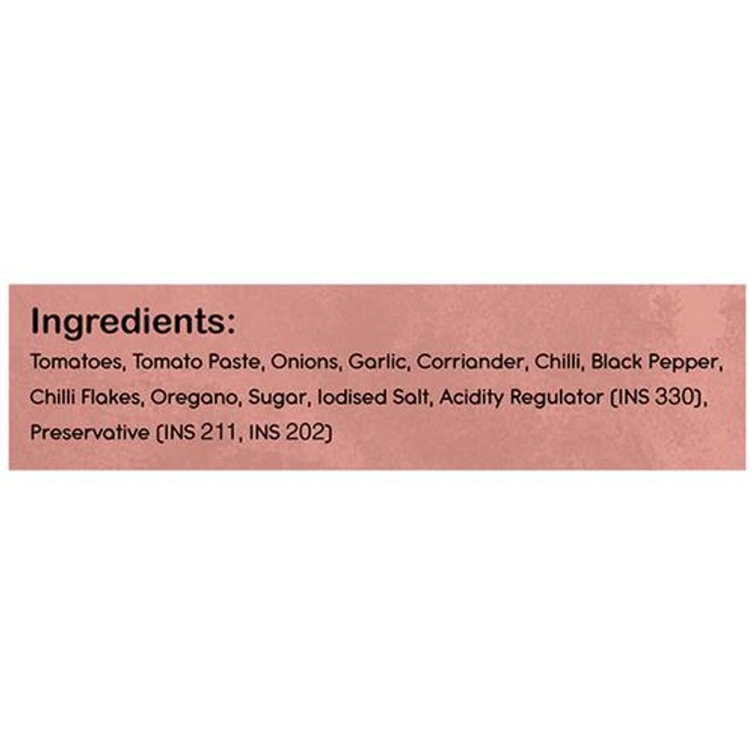 Tomatoes, Tomato Paste, Onions, Garlic, Corriander, Chilli, Black Pepper, Chilli Flakes, Oregano, Sugar, Iodised Salt, Acidity Regulator (INS 330), Preservative (INS 211, INS 202)