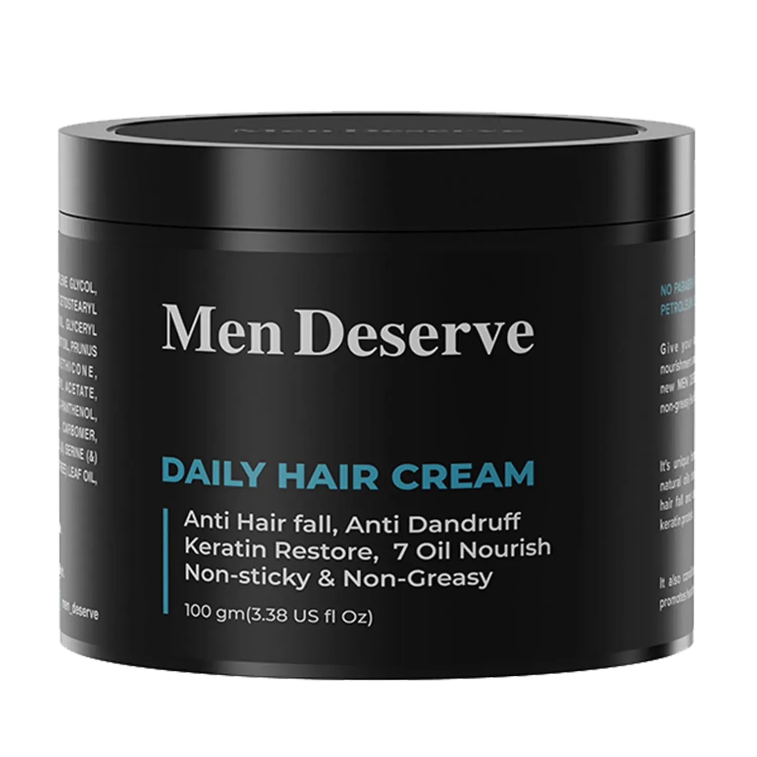 Pamper your hair with the Men Deserve Daily Hair Cream - (100g). This daily-use hair cream nourishes your hair from the roots. Enriched with several natural oils, this Men Deserve hair cream also helps moisturize each strand and promote natural and healthy hair growth.Key Features & Benefits:Daily-use hair cream nourishes your hairEnriched with several natural oils to promote healthy hair growthNon-sticky hair cream gives natural shineChemical-free hair cream for safe useKey Ingredients:Tea tree and peppermint oil: Control dandruffCoconut oil: Nourishes hairHow to Use:Take an adequate amount of cream and gently apply it into your hair. Style your hair however you want.All Ingredients:Tea Tree Oil, Peppermint Oil, Rosemary Oil, Almon Oil, Keratin, Vitamin E, Coconut OilAbout the Brand:Established in 2017 by Young Elegance Life Care, Men Deserve is an Indian beauty, cosmetics, and health care brand. The brand offers premium hair care, skin care, and beard care products explicitly crafted for men. Men Deserve is curated by men, for men because every man deserves a unique makeover. The brand assures quality grooming products that are free from harmful chemicals like sulfate, paraben, and mineral oil to suit every skin and hair type.Check out more Men Deserve Hair Stylings options here, or browse through tokocart's full range of Hair Stylings from top global brands.You can also explore other products from the world of Men Deserve here on tokocart.