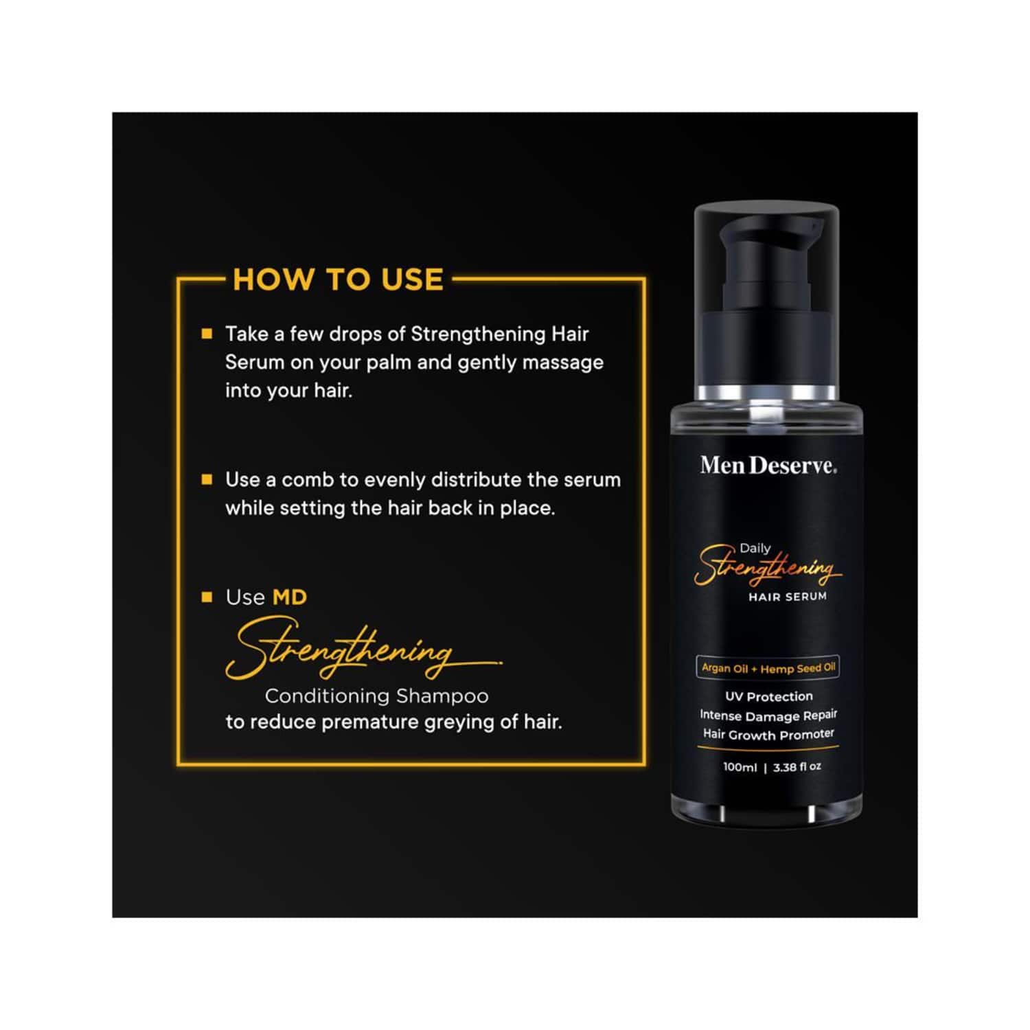 Give your mane the care it deserves with the Men Deserve Daily Strengthening Hair Serum - (100ml). Enriched with argan oil and hemp seed oil, this Men Deserve hair serum promotes hair growth and reduces tangles. This strengthening hair serum also makes your hair soft, shiny, and strong.Key Features & Benefits:Strengthening hair serum makes your hair soft, shiny, and strongEnriched with argan oil and hemp seed oil to promote hair growth and reduce tanglesNon-sticky hair serum strengthens hair folliclesChemical-free hair serum for safe useKey Ingredients:Argan oil: Strengthens hair folliclesHemp seed oil: Prevents hair breakageHow to Use:Take a few drops of the serum on your palm and massage into your hair. Use comb or hair brush to evenly distribute the serum in the hair.All Ingredients:Argan Oil, Hemp Seed Oil, Green Tea Extract, Moringa Oil, Natural Vitamin EAbout the Brand:Established in 2017 by Young Elegance Life Care, Men Deserve is an Indian beauty, cosmetics, and health care brand. The brand offers premium hair care, skin care, and beard care products explicitly crafted for men. Men Deserve is curated by men, for men because every man deserves a unique makeover. The brand assures quality grooming products that are free from harmful chemicals like sulfate, paraben, and mineral oil to suit every skin and hair type.Check out more Men Deserve Hair Stylings options here, or browse through tokocart's full range of Hair Stylings from top global brands.You can also explore other products from the world of Men Deserve here on tokocart.