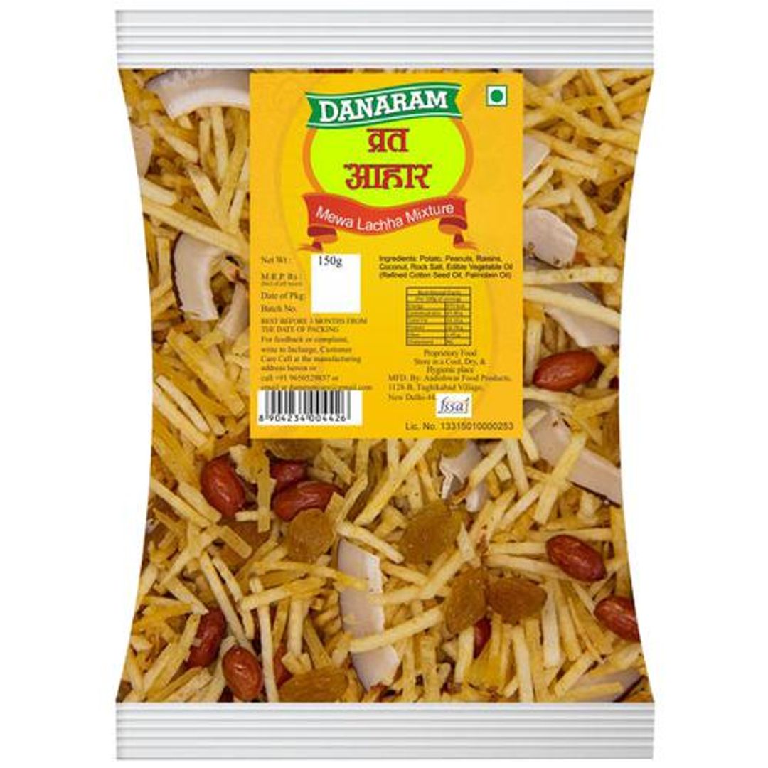 This Mewa Lachha Mixture sweetened mixture of Potato strips, Peanuts, Coconut and Raisins is a tasty snack. Packed in a vacuum-sealed pouch to retain freshness. This is a quality product from Bhikaram Chandmal which is 100% vegetarian and is manufactured under hygienic conditions. This product is made with the finest quality ingredients and originated from the Bikaner, state of Rajasthan in India.