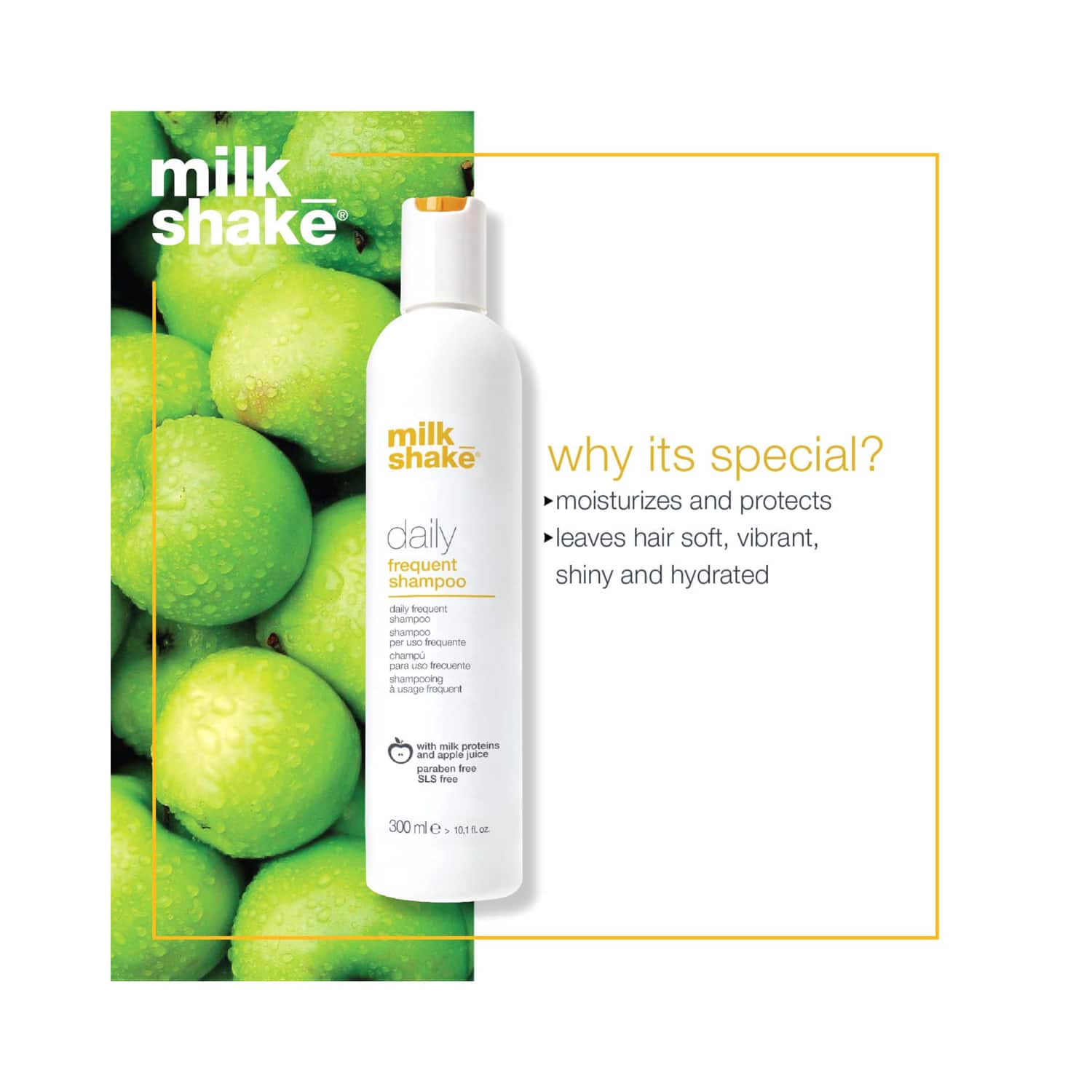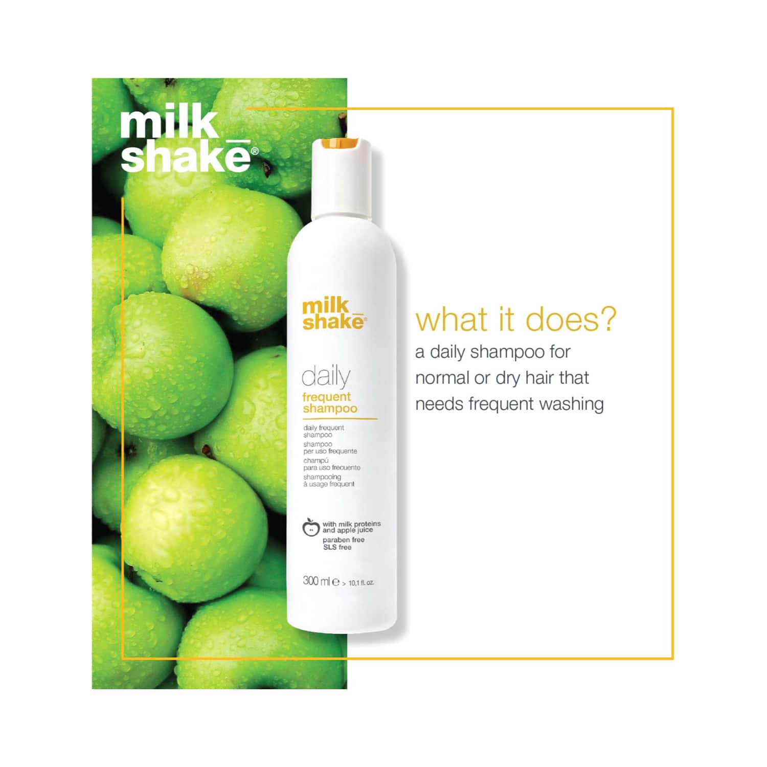 Restore the health and vitality of your scalp and hair with the Milk Shake Daily Frequent Shampoo (300ml). This nourishing shampoo with milk proteins and apple juice hydrates and conditions your hair to make them luxuriously soft, shiny, and manageable. This Milk_shake shampoo helps to cleanse and protect your hair and leaves them feeling healthy.Key Features & Benefits:Shampoo enriched with milk proteins and apple juice to help nourish and condition your hairHelps to prevent colored hair from fadingSulphate-free shampoo suitable for those with allergies or sensitivityShampoo suitable for normal to dry hairKey Ingredients:Milk proteins and apple juice: Hydrate and condition the hairAll Ingredients:Aqua (Water), Ammonium Lauryl Sulfate, Cocamidopropyl Betaine, Sodium Chloride, Glycerin, Disodium Laureth Sulfosuccinate, Peg-120 Methyl Glucose Trioleate, Propylene Glycol, Disodium Edta, Aloe Barbadensis Gel (Aloe Barbadensis Leaf Juice), Hydrolyzed Milk Protein, Helianthus Annuus (Sunflower) Seed Extract, Butylene Glycol, Pyrus Malus (Apple) Juice, Citric Acid, Niacinamide, Calcium Pantothenate, Sodium Ascorbyl Phosphate, Tocopheryl Acetate, Pyridoxine Hcl, Maltodextrin, Sodium Starch Octenylsuccinate, Silica, Parfum (Fragrance), Linalool, Methylchloroisothiazolinone, Methylisothiazolinone, Ci 19140 (Yellow 5), Ci 16035 (Red 40).How to Use:Wet hair thoroughly before shampooing. Take a small amount of the shampoo into your hand and work it through wet hair, massaging until the shampoo is evenly distributed. Rinse off with cool water to remove all traces of shampoo. Follow with your usual conditioner regimen for best results.About the Brand:Milk Shake is a part of the z-one concept group, an Italian company that offers professional salon hair care products to enhance and maintain the hair's natural beauty. Their organic and cruelty-free products provide the benefits of milk and fruit to satisfy the requirements of their worldwide customers. Their wide range of products, like shampoos, hair color, lighteners, and conditioners, incorporate nature-derived ingredients that are highly effective yet gentle on the hair. They formulate products that cater to every customer's unique hair texture, color, length, and style. Milk Shake's professional salon-quality products are packed at the highest concentration levels to ensure maximum results at home or in a salon. The brand promises to transform dry, brittle, and unhealthy hair into shiny, silky, luscious tresses that are manageable with their fun-to-use organic, fragrant, and superior-quality products.Check out more Milk Shake Shampoo options here, or browse through tokocart's full range of Shampoo from top global brands.You can also explore other products from the world of Milk Shake here on tokocart.