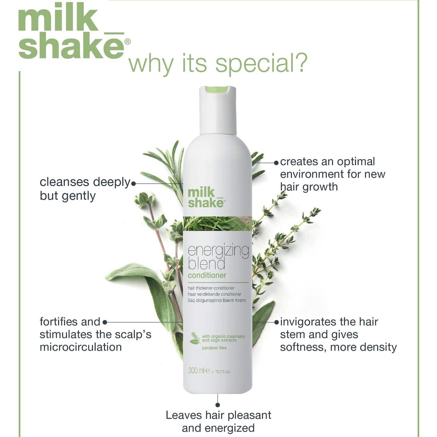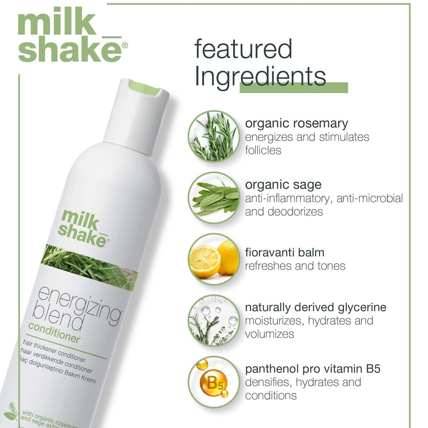 Forget thin hair with the Milk Shake Energizing Blend Conditioner (300ml). This vitamin E hair conditioner nurtures and cleanses hair, adding more density to your hair. It is a hydrating conditioner ideal for nourishing the scalp and hair. The Milk_Shake energizing hair conditioner is also a hair-thickening conditioner that prevents thinning of hair.Key Features & Benefits:Infused with sage extract to provide antiseptic benefitsHair promoting conditioner stimulates new hair growthMoisturizing hair conditioner hydrates hair folliclesParaben-free conditioner for safe useKey Ingredients:Rosemary extract: Promotes hair growthSage extract: Reduces scalp rednessAll Ingredients:Aqua (Water), Cetearyl Alcohol, Cetrimonium Chloride, Glycerin, Oryza Sativa (Rice) Bran Oil, Behenyl Alcohol, Cyclopentasiloxane, Dimethicone, Cyclohexasiloxane, Eucalyptol, Menthol, Panthenol, Tocopheryl Acetate, Arnica Montana Flower Extract, Salvia Officinalis (Sage) Leaf Extract, Rosmarinus Officinalis (Rosemary) Leaf Extract, Aloe Ferox Leaf Juice Extract, Commiphora Myrrha Resin Extract, Angelica Archangelica Root Extract, Acorus Calamus Root Extract, Eugenia Caryophyllus (Clove) Bud Extract, Myristica Fragrans (Nutmeg) Fruit Extract, Piper Nigrum (Pepper) Fruit Extract, Curcuma Zedoaria Root Extract, Zingiber Officinale (Ginger) Rhizome Extract, Elettaria Cardamomum Seed Extract, Citrus Limon Peel Oil, Rosmarinus Officinalis Leaf Oil, Mentha Piperita Herb Oil, Cinnamomum Zeylanicum Leaf Oil, Melaleuca Leucadendron Cajuputi Leaf Oil, Citrus Sinensis Peel Oil Expressed, Citrus Grandis Peel Oil, Citrus Nobilis Peel Oil, Coriandrum Sativum Seed Oil, Citrus Aurantifolia Peel Oil Distilled, Citrus Aurantium Leaf Oil, Phenoxyethanol, Caprylyl Glycol, Citric Acid, Eugenol, Limonene.How to Use:Shampoo your hair and rinse it off well. Apply a small amount of conditioner to your scalp and hair strands. Leave it for 1 minute and rinse well for softer and bouncier hair.About the Brand:Milk Shake is a part of the z-one concept group, an Italian company that offers professional salon hair care products to enhance and maintain the hair's natural beauty. Their organic and cruelty-free products provide the benefits of milk and fruit to satisfy the requirements of their worldwide customers. Their wide range of products, like shampoos, hair color, lighteners, and conditioners, incorporate nature-derived ingredients that are highly effective yet gentle on the hair. They formulate products that cater to every customer's unique hair texture, color, length, and style. Milk Shake's professional salon-quality products are packed at the highest concentration levels to ensure maximum results at home or in a salon. The brand promises to transform dry, brittle, and unhealthy hair into shiny, silky, luscious tresses that are manageable with their fun-to-use organic, fragrant, and superior-quality products.Check out more Milk Shake Conditioner options here, or browse through tokocart's full range of Conditioner from top global brands.You can also explore other products from the world of Milk Shake here on tokocart.