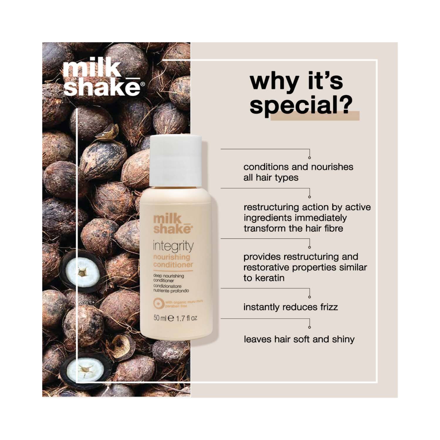 Restore the beauty and health of your locks with the milk_shake Integrity Conditioner (50ml). This nourishing conditioner contains organic murumuru butter to nourish and moisturize damaged and dry hair while preserving the hair color. Plus, this milk_shake hair conditioner has an amino acid complex to keep the hair shiny and full of life.Key Features & Benefits:Enriched with organic murumuru butter to nourish and moisturize dry, damaged hairConditions the hair and preserves its colorAdds shine and vitality to rough hairSuitable for use on all hair types, specifically for damaged hairKey Ingredients:Organic murumuru butter and amino acid complex: Nourish, repair, and strengthen the hairOrganic argan oil: Protects the hair from heat damage, nourishes the hair, and makes it shinier and easier to manageHydrolyzed keratin: Repairs damaged hair, enhances hydration, and eliminate frizz and staticAll Ingredients:Aqua (Water), Myristyl Alcohol, Cetearyl Alcohol, Cetrimonium Chloride, Glycerin, Isododecane, Dimethiconol, Guar Hydroxypropyltrimonium Chloride, Astrocaryum Murumuru Seed Butter, Tocopherol, Hydrolyzed Keratin, Argania Spinosa Kernel Oil, Tocopheryl Acetate, Disodium Edta, Citric Acid, Methylchloroisothiazolinone, Methylisothiazolinone, Magnesium Nitrate, Magnesium Chloride, Lactobacillus Ferment, Phenoxyethanol, Parfum (Fragrance).How to Use:Shampoo your hair. Take an adequate amount of the conditioner and apply it to your hair, massaging it into its lengths and ends. Leave it in for a few minutes, then rinse it off thoroughly. Repeat the process if required.About the Brand:Milk Shake is a part of the z-one concept group, an Italian company that offers professional salon hair care products to enhance and maintain the hair's natural beauty. Their organic and cruelty-free products provide the benefits of milk and fruit to satisfy the requirements of their worldwide customers. Their wide range of products, like shampoos, hair color, lighteners, and conditioners, incorporate nature-derived ingredients that are highly effective yet gentle on the hair. They formulate products that cater to every customer's unique hair texture, color, length, and style. Milk Shake's professional salon-quality products are packed at the highest concentration levels to ensure maximum results at home or in a salon. The brand promises to transform dry, brittle, and unhealthy hair into shiny, silky, luscious tresses that are manageable with their fun-to-use organic, fragrant, and superior-quality products.Check out more Milk Shake Conditioner options here, or browse through tokocart's full range of Conditioner from top global brands.You can also explore other products from the world of Milk Shake here on tokocart.