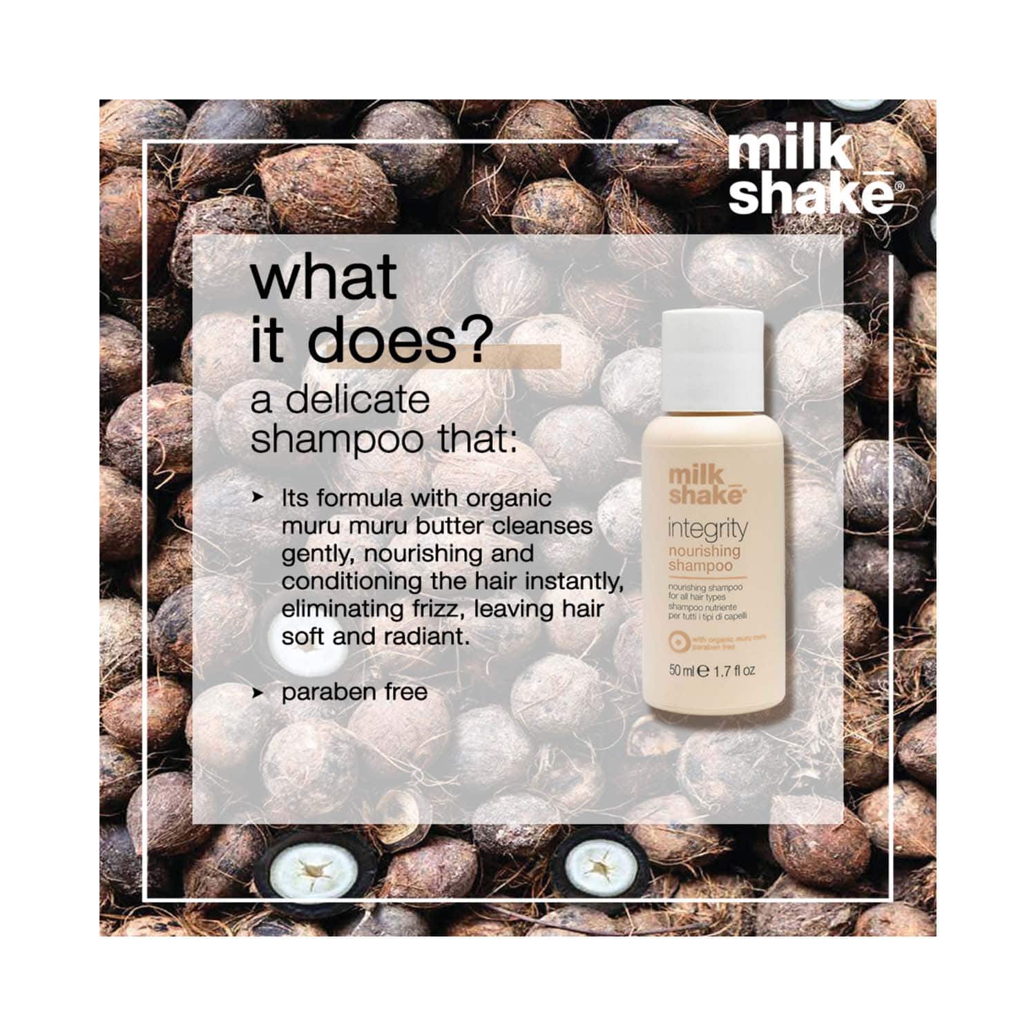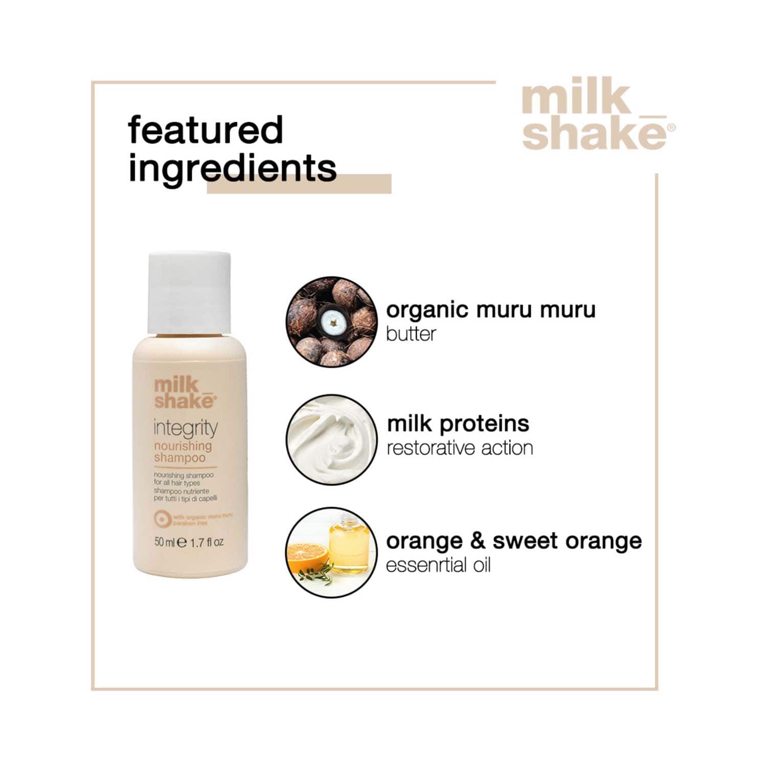 Make every day a good hair day with the milk_shake Integrity Shampoo (50ml). This nourishing shampoo is a sulfate-free shampoo that cleanses the hair gently and contains organic murumuru butter to maintain the vibrancy of hair color. Plus, this milk_shake shampoo conditions, smoothens, and moisturizes the hair instantly to eliminate frizz, leaving the hair soft and radiant.Key Features & Benefits:Enriched with organic murumuru butter to maintain the vibrancy of hair colorCleanses the hair gently but thoroughlySmoothens and moisturizes the hair to eliminate frizzFree from parabens and sulfates to ensure safe use on all hair typesKey Ingredients:Organic murumuru butter and amino acid complex: Nourish, repair, and strengthen the hairAll Ingredients:Aqua (Water), Sodium Methyl 2-Sulfolaurate, Cetyl Betaine, Disodium 2-Sulfolaurate, Styrene/Acrylates Copolymer, Sodium Chloride, Glycerin, Polyquaternium-10, Coco-Glucoside, Astrocaryum Murumuru Seed Butter, Argania Spinosa Kernel Oil, Peg-120 Methyl Glucose Trioleate, Tocopherol, Propylene Glycol, Citric Acid, Methylchloroisothiazolinone, Methylisothiazolinone, Benzoic Acid, Magnesium Nitrate, Magnesium Chloride, Parfum (Fragrance).How to Use:Wet your hair. Take a sufficient amount of the shampoo in your palm and apply it to your hair. Massage the product into your hair to create a lather, then wash it off thoroughly. Repeat the process if required.About the Brand:Milk Shake is a part of the z-one concept group, an Italian company that offers professional salon hair care products to enhance and maintain the hair's natural beauty. Their organic and cruelty-free products provide the benefits of milk and fruit to satisfy the requirements of their worldwide customers. Their wide range of products, like shampoos, hair color, lighteners, and conditioners, incorporate nature-derived ingredients that are highly effective yet gentle on the hair. They formulate products that cater to every customer's unique hair texture, color, length, and style. Milk Shake's professional salon-quality products are packed at the highest concentration levels to ensure maximum results at home or in a salon. The brand promises to transform dry, brittle, and unhealthy hair into shiny, silky, luscious tresses that are manageable with their fun-to-use organic, fragrant, and superior-quality products.Check out more Milk Shake Shampoo options here, or browse through tokocart's full range of Shampoo from top global brands.You can also explore other products from the world of Milk Shake here on tokocart.