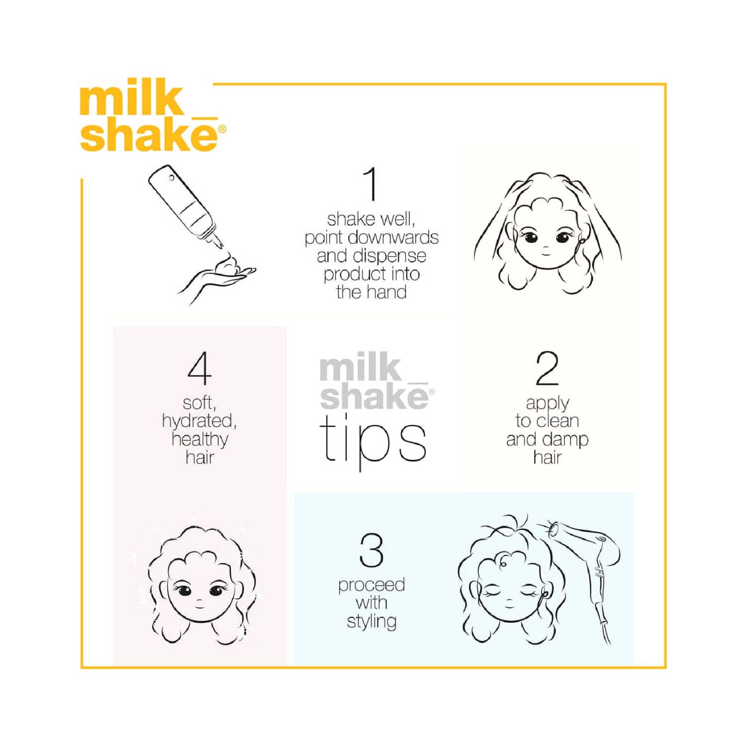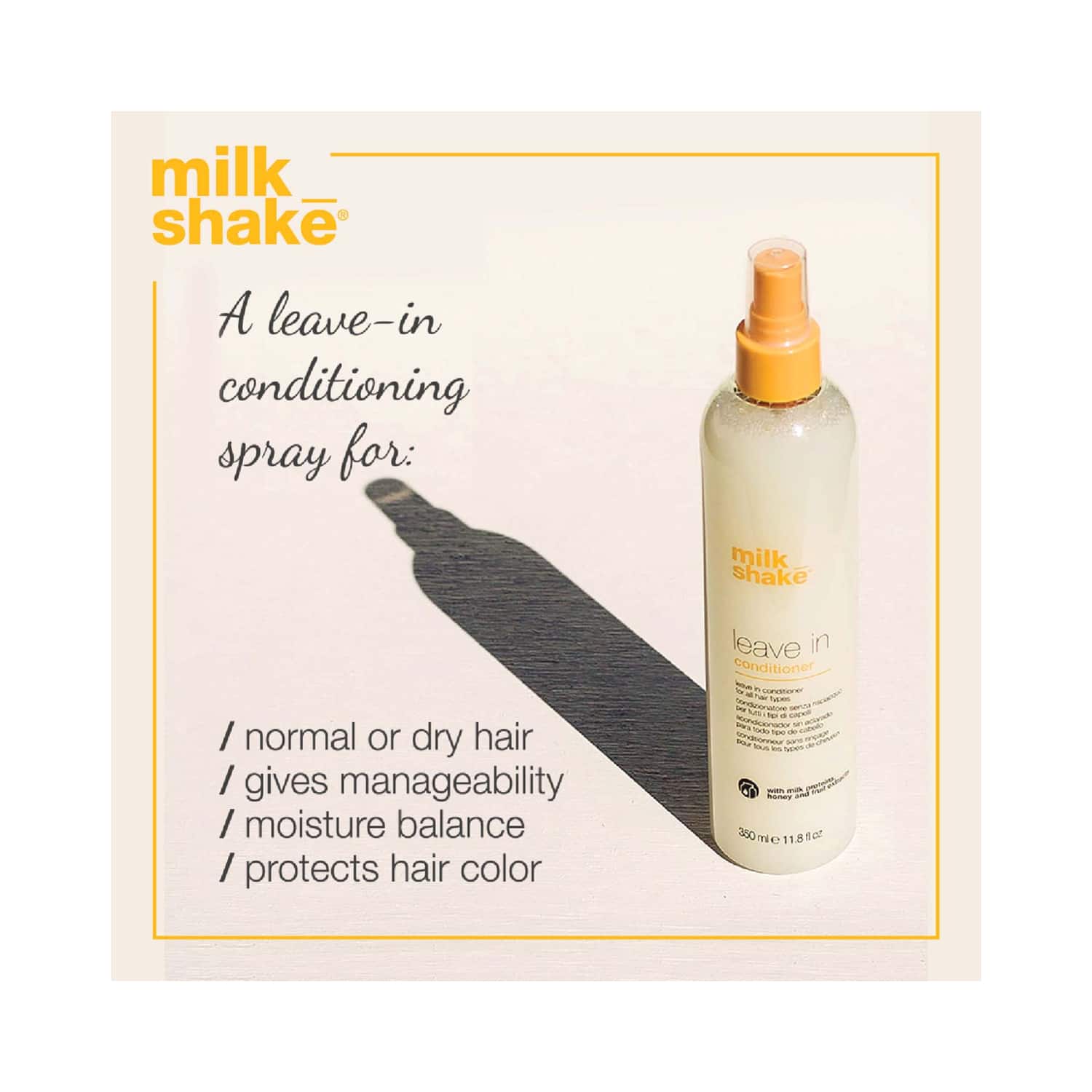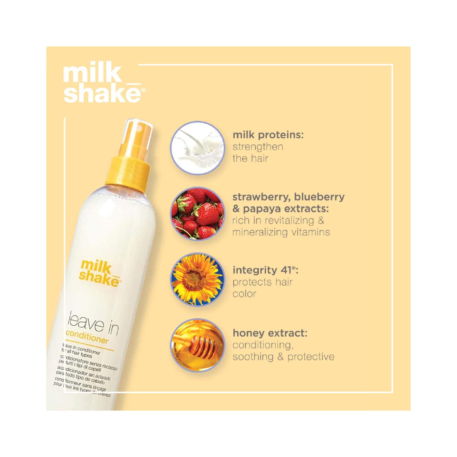 Revitalize your hair with the Milk Shake Leave In Conditioner (350ml). This vitamin E hair conditioner maintains optimal moisture balance and detangles it while preserving the integrity of the hair color. It is a strengthening conditioner ideal for protecting hair fiber. The Milk_Shake hair conditioner is also a sun-protecting conditioner that guards your hair against UV rays.Key Features & Benefits:Infused with integrity 41 to prevent hair color fadingFormulated with UV filter for added protection from sun raysMoisturizing hair conditioner balances moisture in your hairHair shining conditioner enhances the gloss of your hairKey Ingredients:Milk protein: Strengthens the hairHoney extract: Adds shine to your hairIntegrity 41: Improves your hair colorAll Ingredients:Aqua (Water), Polyquaternium-22, Cetrimonium Chloride, Polyquaternium-7, Peg-40 Hydrogenated Castor Oil, Hydrolyzed Milk Protein, Hydroxypropyltrimonium Hydrolyzed Casein, Mel Extract (Honey Extract), Fragaria Vesca (Strawberry) Fruit Extract, Carica Papaya (Papaya) Fruit Extract, Vaccinium Myrtillus Fruit/Leaf Extract, Helianthus Annuus (Sunflower) Seed Extract, Peg-5 Cocomonium Methosulfate, Sodium Glutamate, Sodium Cocoyl Glutamate, Hydroxypropyl Guar Hydroxypropyltrimonium Chloride, Propylene Glycol, Amodimethicone, Trideceth-12, Butylene Glycol, Sodium Methylparaben, Imidazolidinyl Urea, Disodium Edta, Benzophenone-4, Citric Acid, Benzyl Alcohol, Parfum (Fragrance).How to Use:Spray over clean, damp hair. Distribute and proceed with the desired style.About the Brand:Milk Shake is a part of the z-one concept group, an Italian company that offers professional salon hair care products to enhance and maintain the hair's natural beauty. Their organic and cruelty-free products provide the benefits of milk and fruit to satisfy the requirements of their worldwide customers. Their wide range of products, like shampoos, hair color, lighteners, and conditioners, incorporate nature-derived ingredients that are highly effective yet gentle on the hair. They formulate products that cater to every customer's unique hair texture, color, length, and style. Milk Shake's professional salon-quality products are packed at the highest concentration levels to ensure maximum results at home or in a salon. The brand promises to transform dry, brittle, and unhealthy hair into shiny, silky, luscious tresses that are manageable with their fun-to-use organic, fragrant, and superior-quality products.Check out more Milk Shake Conditioner options here, or browse through tokocart's full range of Conditioner from top global brands.You can also explore other products from the world of Milk Shake here on tokocart.