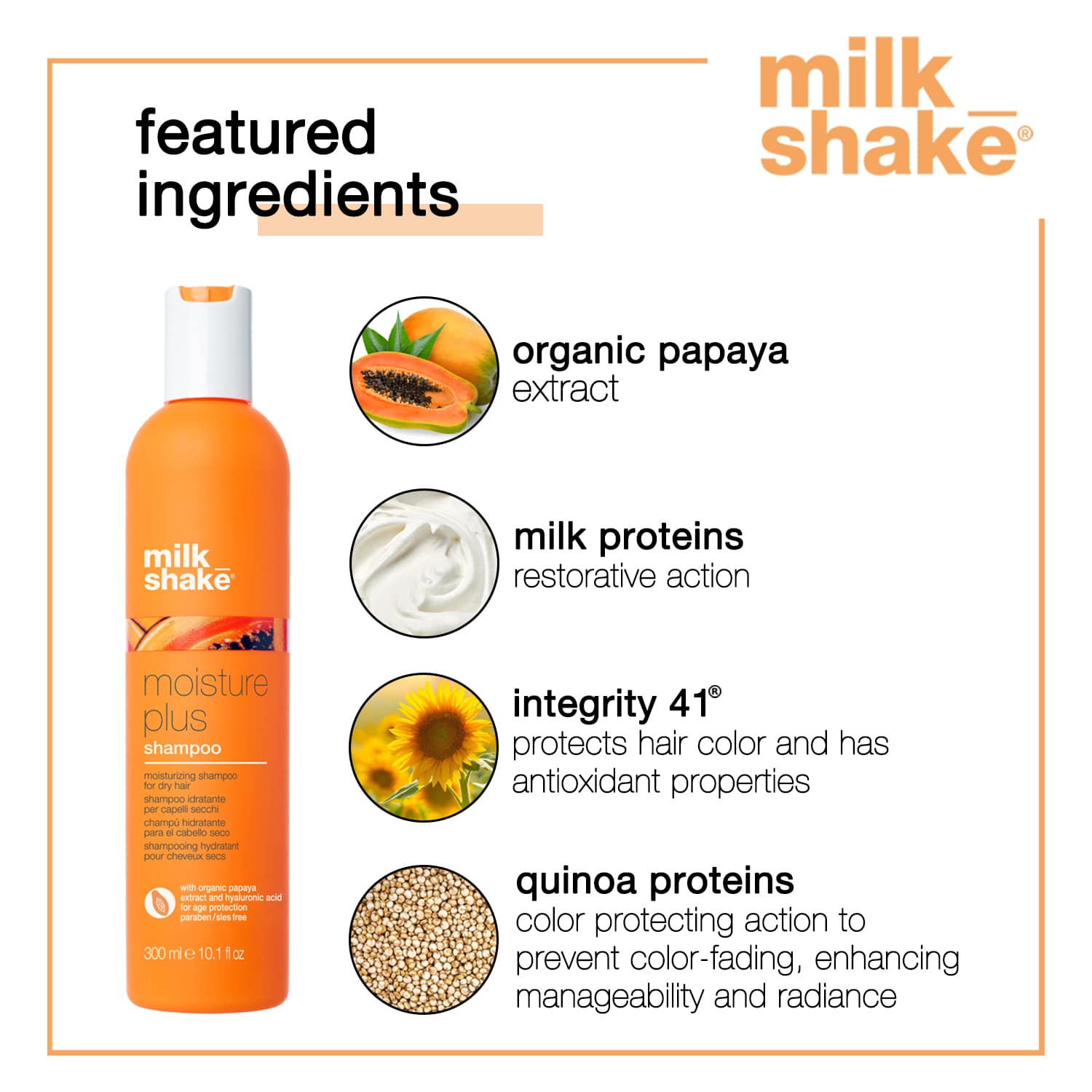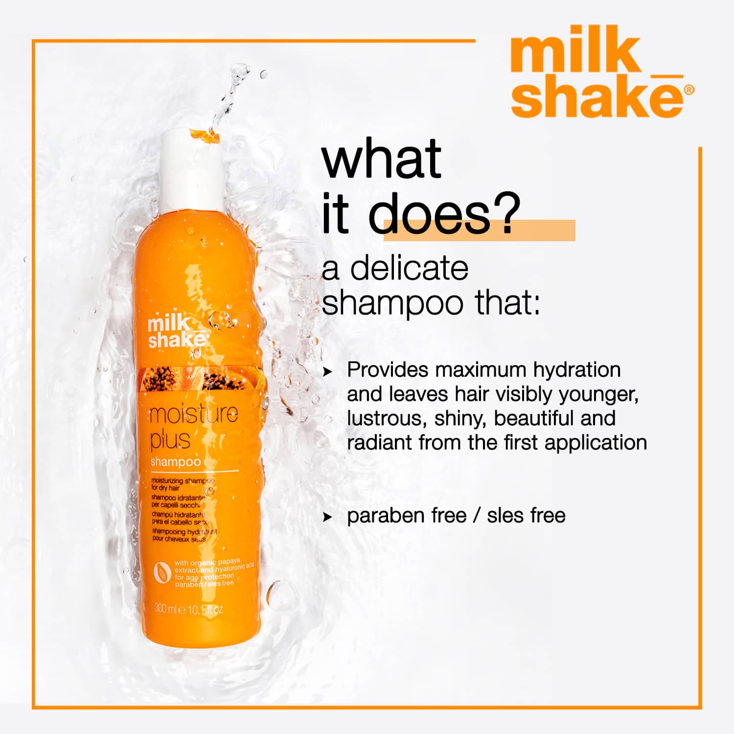 Breathe life into dry and damaged hair with the Milk Shake Love Children Moisture Plus Shampoo (300ml). This moisturizing shampoo will give you luxurious and easy-to-manage locks. The Milk Shake shampoo makes hair healthy and lustrous with its magical blend of organic papaya extract, Integrity 41, and hyaluronic acid. The hydrating shampoo locks in moisture, leaving the scalp squeaky clean. It helps achieve a visibly younger mane after every wash with this anti-aging shampoo.Key Features & Benefits:Blend of organic papaya extract, Integrity 41, and hyaluronic acid nourishes hair and protects color, making it visibly youngerActive ingredients help maintain optimal moisture balanceMilk proteins condition hair giving it softness and strengthHyaluronic acid, quinoa proteins, and milk proteins replenish hair from the first washKey Ingredients:Organic papaya extract, integrity 41, and hyaluronic acid: Anti-aging properties nourish hair and make it visibly youngerQuinoa and milk proteins: Give strength, resistance, and moistureAll Ingredients:Aqua (Water), Ammonium Lauryl Sulfate, Cocamidopropyl Betaine, Sodium Chloride, Dicaprylyl Ether, Decyl Glucoside, Glyceryl Oleate, Styrene/Acrylates Copolymer, Guar Hydroxypropyltrimonium Chloride, Coco-Glucoside, Glycerin, Sodium Hydroxide, Tocopheryl Acetate, Carica Papaya (Papaya) Fruit Extract, Peg-8 Dimethicone, Sodium Hyaluronate Crosspolymer, Hydrolyzed Glycosaminoglycans, Sodium Hyaluronate, Hydrolyzed Hyaluronic Acid, Hyaluronic Acid, Helianthus Annuus (Sunflower) Seed Extract, Hydrolyzed Milk Protein, Hydrolyzed Quinoa, Fragaria Ananassa (Strawberry) Fruit Extract, Lycium Barbarum Fruit Extract, Ethylhexyl Methoxycinnamate, Diethylamino Hydroxybenzoyl Hexyl Benzoate, Parfum (Fragrance), Propylene Glycol, Butylene Glycol, Citric Acid, Methylchloroisothiazolinone, Methylisothiazolinone, Sodium Benzoate, Potassium Sorbate, Benzyl Alcohol, Benzyl Salicylate, Limonene, Linalool, Phenoxyethanol, Glycine, Sodium Lactate, Sodium Citrate, Magnesium Nitrate, Magnesium Chloride, Ci 16035 (Red 40), Ci 19140 (Yellow 5).How to Use:First, wet your hair thoroughly. Then, squeeze the required amount of shampoo on your palm and create a lather by rubbing your hands together. Next, apply the lathered shampoo on your scalp generously. Last, rinse your hair with water and follow by using a conditioner.About the Brand:Milk Shake is a part of the z-one concept group, an Italian company that offers professional salon hair care products to enhance and maintain the hair's natural beauty. Their organic and cruelty-free products provide the benefits of milk and fruit to satisfy the requirements of their worldwide customers. Their wide range of products, like shampoos, hair color, lighteners, and conditioners, incorporate nature-derived ingredients that are highly effective yet gentle on the hair. They formulate products that cater to every customer's unique hair texture, color, length, and style. Milk Shake's professional salon-quality products are packed at the highest concentration levels to ensure maximum results at home or in a salon. The brand promises to transform dry, brittle, and unhealthy hair into shiny, silky, luscious tresses that are manageable with their fun-to-use organic, fragrant, and superior-quality products.Check out more Milk Shake Shampoo options here, or browse through tokocart's full range of Shampoo from top global brands.You can also explore other products from the world of Milk Shake here on tokocart.