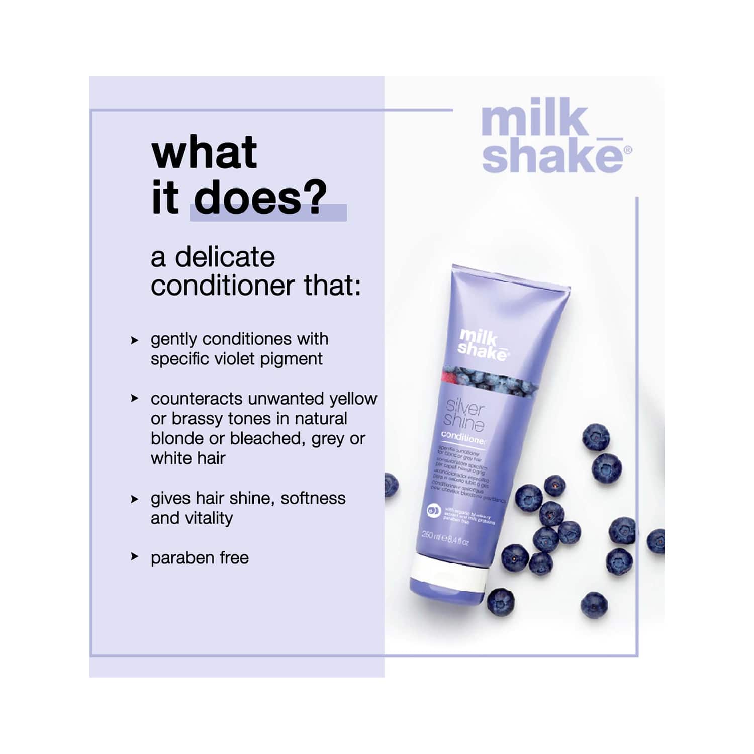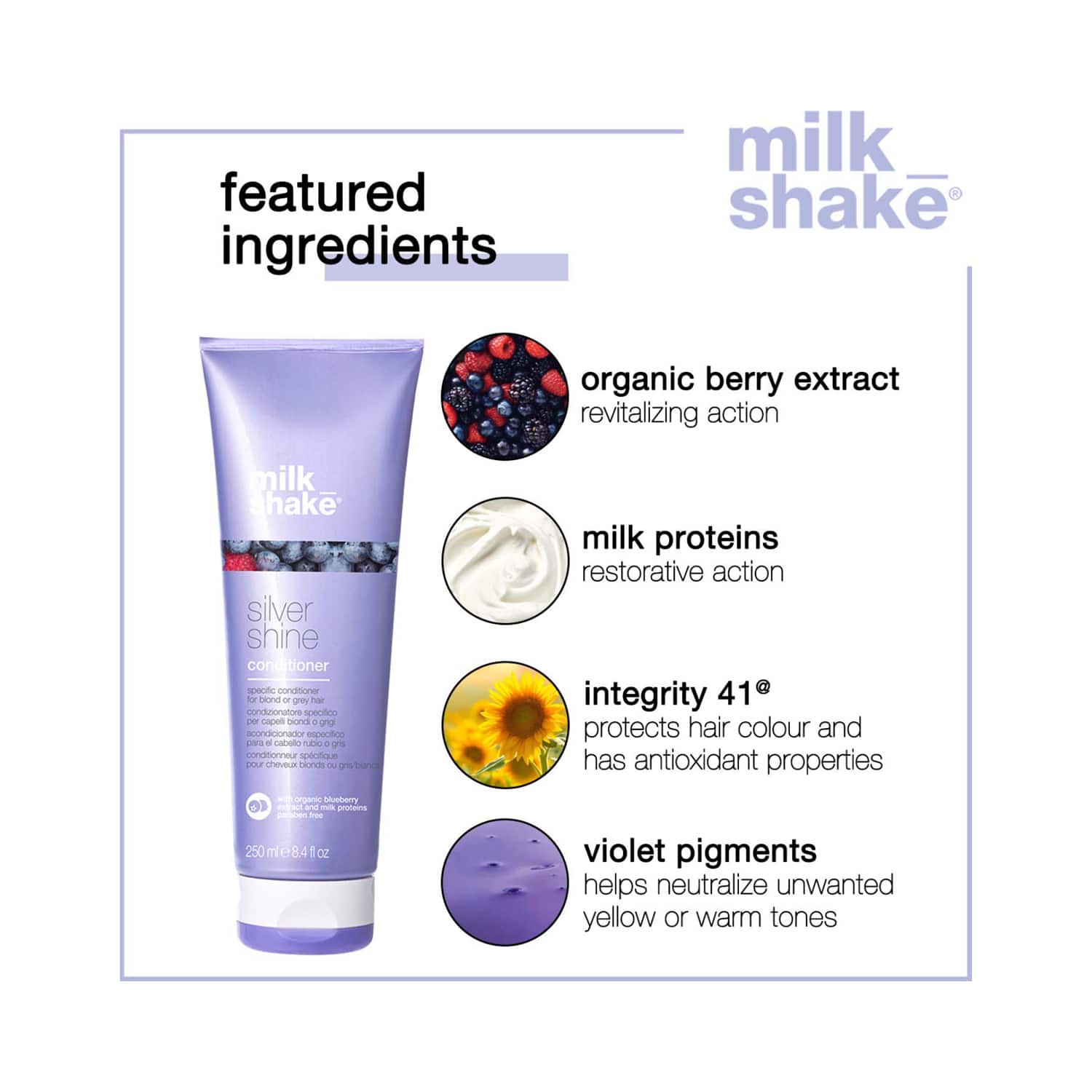 Get soft and beautiful hair with the Milk Shake Silver Shine Conditioner (300ml). This nourishing hair conditioner helps maintain hair's moisture balance and protects the color. It is a hair-shining conditioner that leaves hair well-groomed, soft, and revitalized. The Milk_Shake conditioner is also a color-enhancing hair conditioner that neutralizes unwanted yellow, gold, or brassy tones.Key Features & Benefits:Infused with milk protein to strengthen your hairMoisturizing hair conditioner balances moisture in your hairRevitalizing conditioner neutralizes unwanted yellow tonesParaben-free conditioner for safe useKey Ingredients:Organic berry extracts: Conditions your hair and scalpMilk protein: Enhances the shine of the hairIntegrity 41: Improves your hair colorAll Ingredients:Aqua (Water), Myristyl Alcohol, Cetrimonium Chloride, Propylheptyl Caprylate, Behentrimonium Chloride, Hydrogenated Castor Oil/Sebacic Acid Copolymer, Polyglyceryl-3 Pca, Dimethicone, Ethylhexyl Cocoate, Cetearyl Alcohol, Cocos Nucifera (Coconut) Oil, Helianthus Annuus (Sunflower) Seed Extract, Hydrolyzed Milk Protein, Rubus Fruticosus (Blackberry) Fruit Extract, Rubus Idaeus (Raspberry) Leaf Extract, Vaccinium Myrtillus Fruit Extract, Fragaria Ananassa (Strawberry) Fruit Extract, Lactic Acid, Diazolidinyl Urea, Sodium Benzoate, Potassium Sorbate, Acid Violet 43, Parfum (Fragrance), Citric Acid, Butylene Glycol, Benzyl Alcohol, Benzyl Benzoate, Benzyl Salicylate, Limonene, Linalool.How to Use:Shampoo your hair and rinse it off well. Apply a small amount of conditioner to your scalp and hair strands. Leave it for 1 minute and rinse well for softer and bouncier hair.About the Brand:Milk Shake is a part of the z-one concept group, an Italian company that offers professional salon hair care products to enhance and maintain the hair's natural beauty. Their organic and cruelty-free products provide the benefits of milk and fruit to satisfy the requirements of their worldwide customers. Their wide range of products, like shampoos, hair color, lighteners, and conditioners, incorporate nature-derived ingredients that are highly effective yet gentle on the hair. They formulate products that cater to every customer's unique hair texture, color, length, and style. Milk Shake's professional salon-quality products are packed at the highest concentration levels to ensure maximum results at home or in a salon. The brand promises to transform dry, brittle, and unhealthy hair into shiny, silky, luscious tresses that are manageable with their fun-to-use organic, fragrant, and superior-quality products.