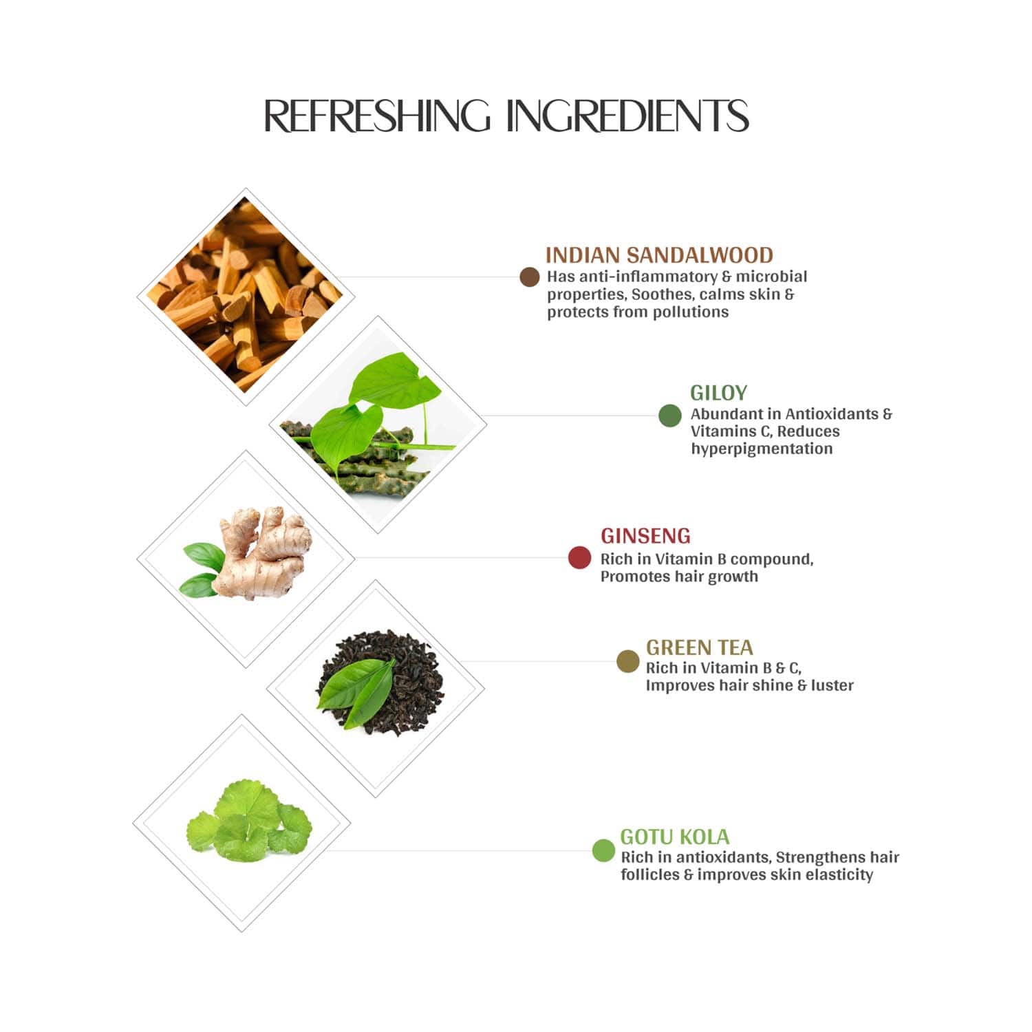 Key Ingredients:Indian sandalwood: Has anti-inflammatory and microbial properties, soothes and calms the skin, and protects from pollutionGiloy: Has antioxidants and fights hyperpigmentationGinseng: Promotes hair growthGreen tea: Improves hair lusterGotu kola: Rich in antioxidants, strengthens the hair follicles, and improves skin elasticityWhite turmeric extract, bitter almond mandelic acid, agarwood essential oil, and saffron essential oil: Improve skin and hair health, strengthen the hair, and reduce hair lossHyaluronic acid, nano collagen, alpha arbutin, vitamins A, C, and E, and omega-3 fatty acids: Protect the skin and hair from hard water and pollution and replenish lost moistureArgan and rosehip oil, licorice, Japanese honeysuckle, and mulberry: Nourish and moisturize the skin and promote voluminous, shiny hair