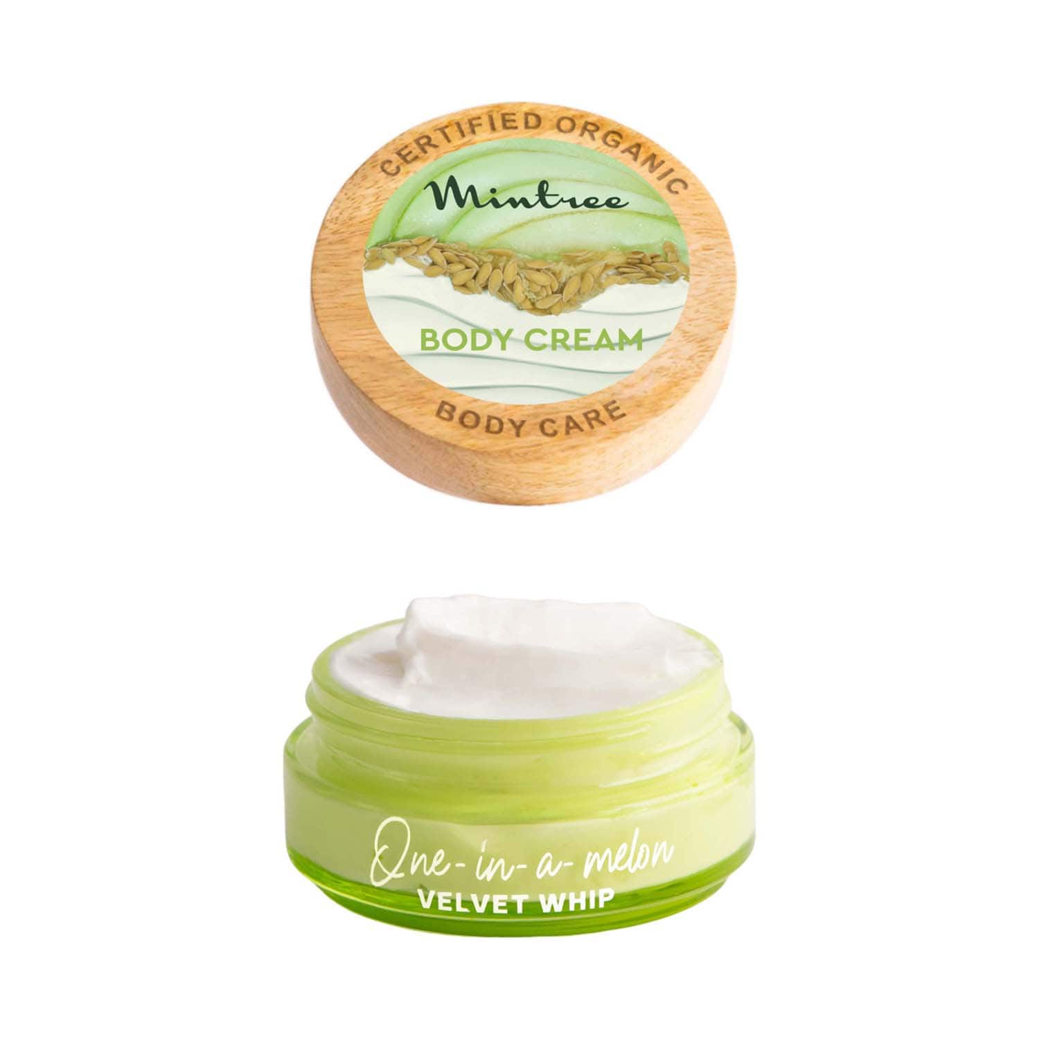 Make dry, dull skin a thing of the past with the Mintree Certified Organic Melon Body Butter With 72 Hrs Hydration (150g). Infused with vitamin C-rich Muskmelon extract, this brightening body butter enhances the skin tone and restores natural radiance. This Mintree body butter also contains niacinamide to even out the complexion and smoothen the skin texture. Plus, this moisturizing body butter with mango seed butter and apricot oil deeply nourishes and hydrates the skin for up to 72 hours, leaving it soft and supple.Key Features & Benefits:Formulated vitamin C-rich Muskmelon extract to brighten the skin toneAdded niacinamide evens out the complexion and smoothens the skin textureContains mango seed butter and apricot oil to moisturize and soften dry, rough skinOrganic and cruelty-free formula does not contain sulfate, silicone, or paraben to ensure safe useKey Ingredients:Muskmelon: Rich in vitamin C and brightens the skin toneApricot kernel butter: Rich in amino acids and replenishes the skin's lost moisturePhyto collagen: Rich in amino acids and promotes skin elasticityProvitamin B5: Soothes and calms the skinHyaluronic acid: Hydrates and plumps skinMango seed butter: Moisturizes the skinNiacinamide: Brightens the skin and evens out its tone and textureAll Ingredients:Muskmelon Extract (Cucumis Melo Fruit Extract), Niacinamide, Mango Seed Butter, Vitamin C, Apricot, OilHow to Use:Wash your skin. Take a little bit of the body butter and apply it to your skin. After that, massage well for increased hydration.About the Brand:Founded in 2013 by Kanika Dewani, Mintree is a certified organic personal care brand. With a goal to change the scope of Indian beauty standards, Mintree has a robust research team that incorporates international beauty trends into the natural care methods vouched for by many Indians. Mintree is mindful of the environment, placing importance on clean methods of manufacture and responsibly sourced organic ingredients. To ensure that it maintains its own high standards, all of Mintree's products are made with no parabens, sulfates, mineral oil, or silicone, guaranteeing safety for the customer and the planet.Check out more Mintree Body Butters options here, or browse through tokocart's full range of Body Butters from top global brands.You can also explore other products from the world of Mintree here on tokocart.