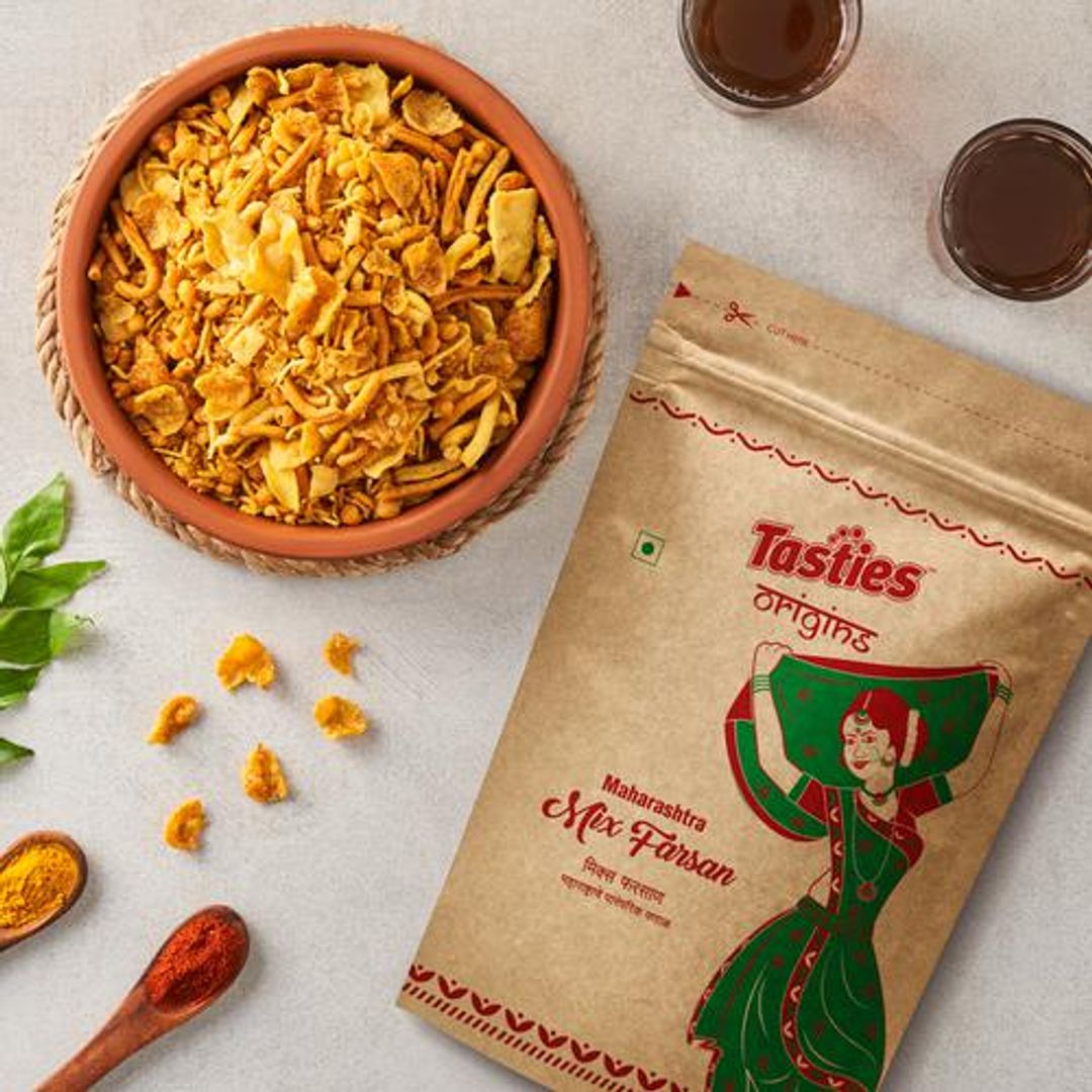 Healthy, delicious, and flavourful, our Maharashtra Mix Farsan Namkeen - Crispy is crunchy, satisfying, savoury and is a classic to - go snack. Perfectly blended with fresh and local spices just the way you like it, our snacky treats are the perfect munchie to carry with you everywhere and offer a unique texture that satisfies your hunger pangs. A crispy snack that you will love, our treat come with a spicy tadka and are naturally processed with the finest Maharashtrian split chickpea flour and blended well with red lentils and red chilli powder. Our Farsan Namkeen is a traditional recipe that you can relish and have at any time of the day and is sure to make your tastebuds dance. Not only satisfying, but our treat is also convenient and a natural energy booster. Packed with nutrition, our Maharashtra Mix Farsan Namkeen - Crispy has no added preservatives and no trans-fat and is the best snack to have in your pantry. Indulge in savour goodness with our Maharashtra Mix Farsan Namkeen - Crispy now! Experiment with the eclectic range of Tasties Origin's Namkeen collections on Big Basket from Lahsun Sev, Indori Mixture, and more, where tradition meets flavour in local recipes.