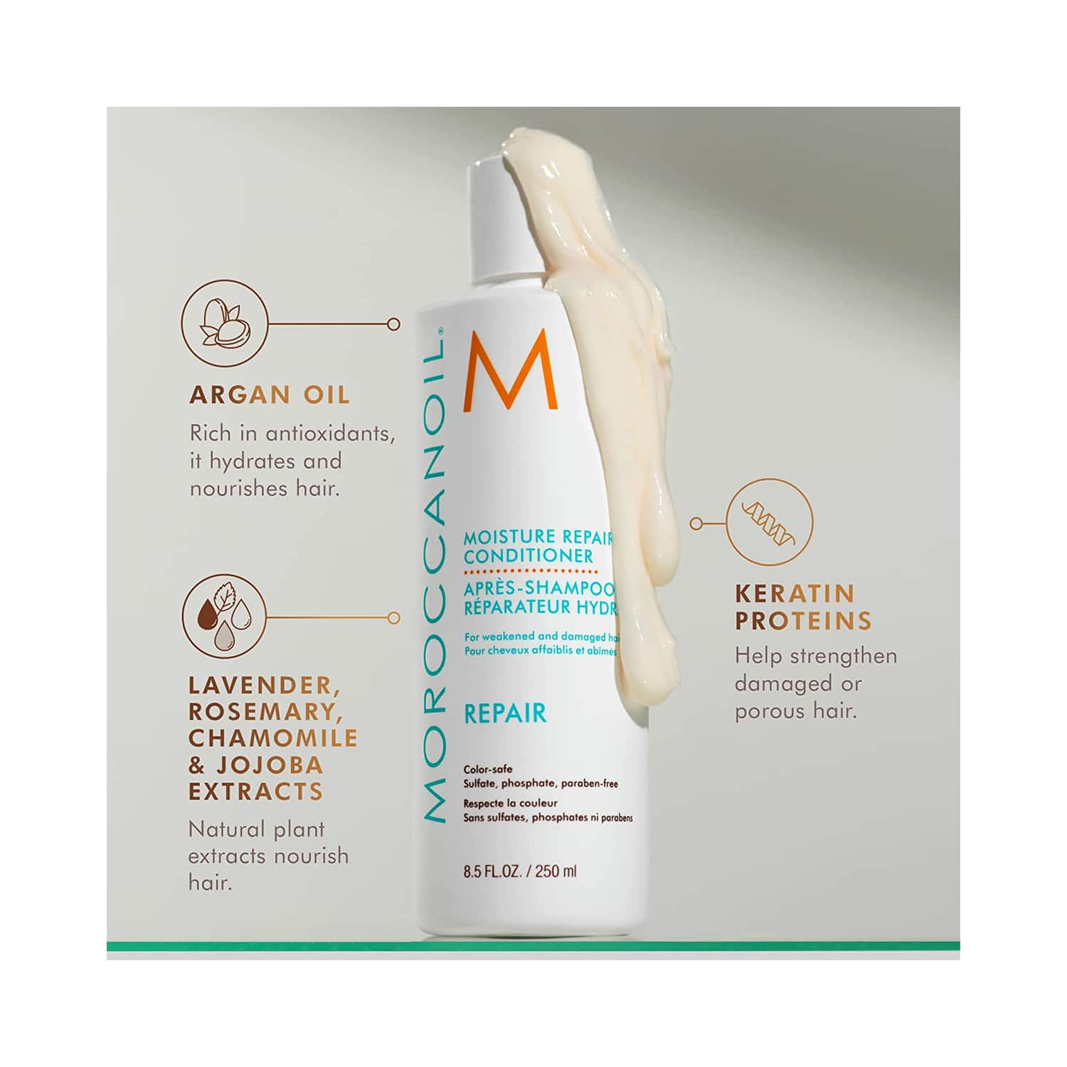 For dried, damaged hair, the Moroccanoil Moisture Repair Conditioner (250ml) is a must-have. This moisturizing conditioner replenishes hair with essential nutrients and antioxidants for healthier and hydrated hair. Also, this Moroccanoil conditioner has argan oil and other reconstructive ingredients to restore elasticity, moisture, and manageability. Plus, it won't dry, fade, or strip color-treated hair.Key Features & Benefits:Hair conditioner restores hair health with antioxidant argan oil, reconstructive keratin, and fatty acidsHelps restore elasticity and manageability in your hairIntensely conditions and moisturizes dry hairConditioner is free of sulfates, phosphates, and parabens for safe use on color-treated hairKey Ingredients:Argan oil: Has vitamin E, essential fatty acids, and antioxidants to nourish the hairAll Ingredients:Aqua/Water/Eau-Solvent, Sodium Lauroyl Sarcosinate-Surfactant/?Cleansing, Emulsifying, Viscosity Controlling, Cocamidopropyl Hydroxysultaine-Surfactant/?Cleansing, Viscosity Controlling.How to Use:Shampoo your hair and rinse it off well. Apply a small amount of conditioner to your scalp and hair strands. Leave it for 1 minute and rinse well for softer and bouncier hair.About the Brand:Founded in 2007 by Carmen Tal, Moroccanoil is a luxury hair care and body care brand offering a comprehensive line of products. They aim to solve day-to-day skincare issues with naturally enriched and affordable products. Most of their formulations contain argan oil and other natural herbs to ensure quick and sustainable results. In addition, the brand checks each of its products through stringent quality checks to ensure safe and effective use.Check out more Moroccanoil Conditioner options here, or browse through tokocart's full range of Conditioner from top global brands.You can also explore other products from the world of Moroccanoil here on tokocart.