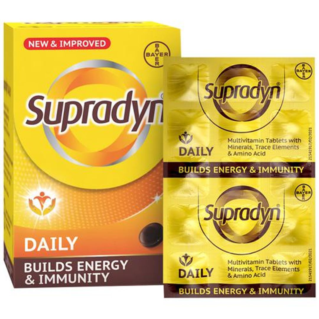 Supradyn Tablets contain 11 vitamins, 5 minerals and 4 trace elements for immune support against cold, flu and viral infections Features: 1. Boost your immunity with Supradyn – it contains 11 vitamins, 5 minerals, and 4 trace elements 2. It contains Vitamin C (Ascorbic Acid IP 150 mg) which helps in wound healing, improves immunity and helps in absorption of iron 3. Supradyn contains Vitamin D3, which helps preserve bone health, enhances immunity and energy level 4. It also contains Vitamin B complex which helps in the functioning of the immune system, metabolism 5. Supradyn contains minerals like calcium, which is important in maintaining healthy bones