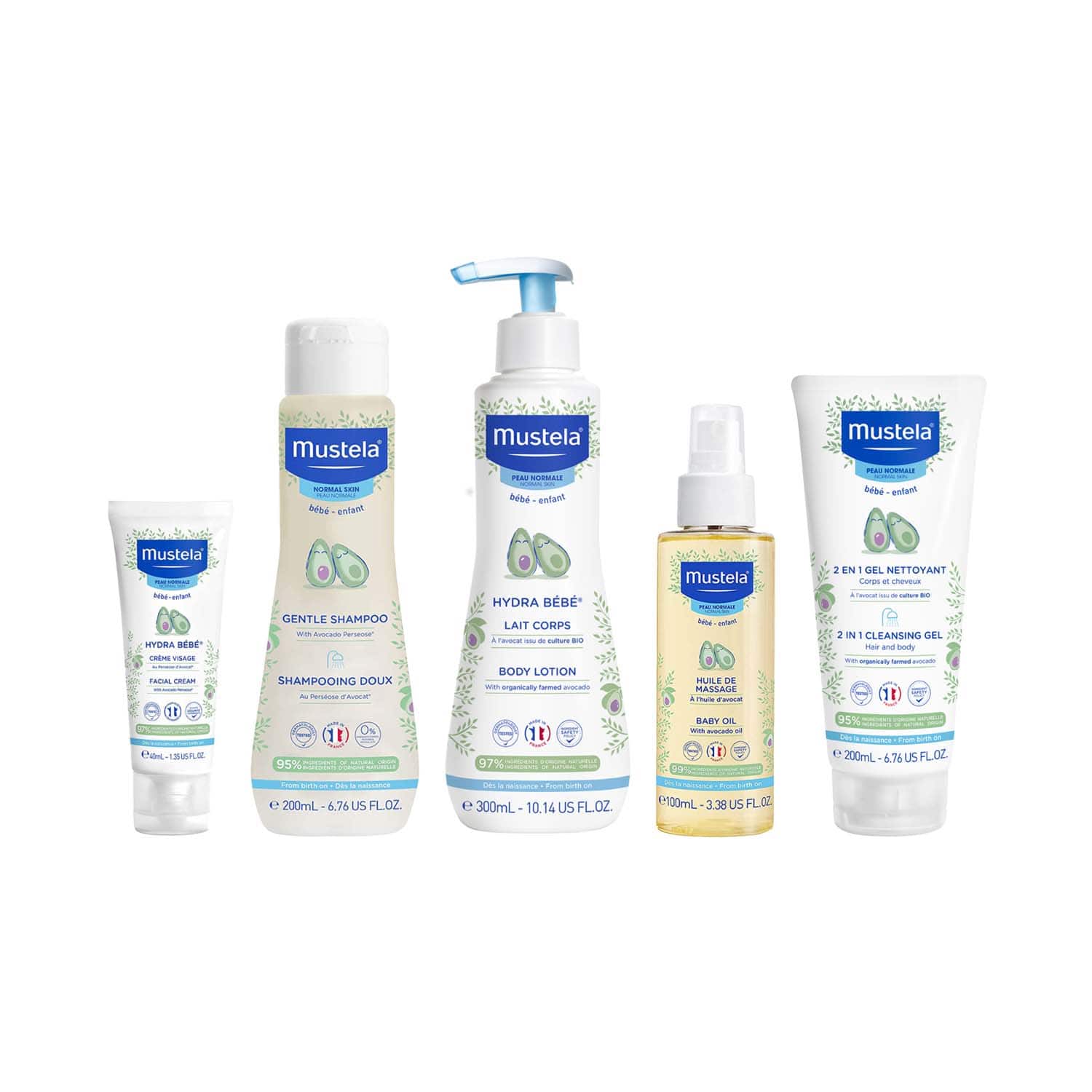 Care for your baby's skin with the Mustela Newborn Arrival Gift Set (5 pcs). This complete baby care set contains a baby shampoo, cleansing gel, facial cream, lotion, and oil. The products in the Mustela set are formulated with avocado that hydrates, cleanses, and soothes the skin. Also, the products in this baby essentials set have a gentle, natural formulation that moisturizes delicate skin and repairs dryness.