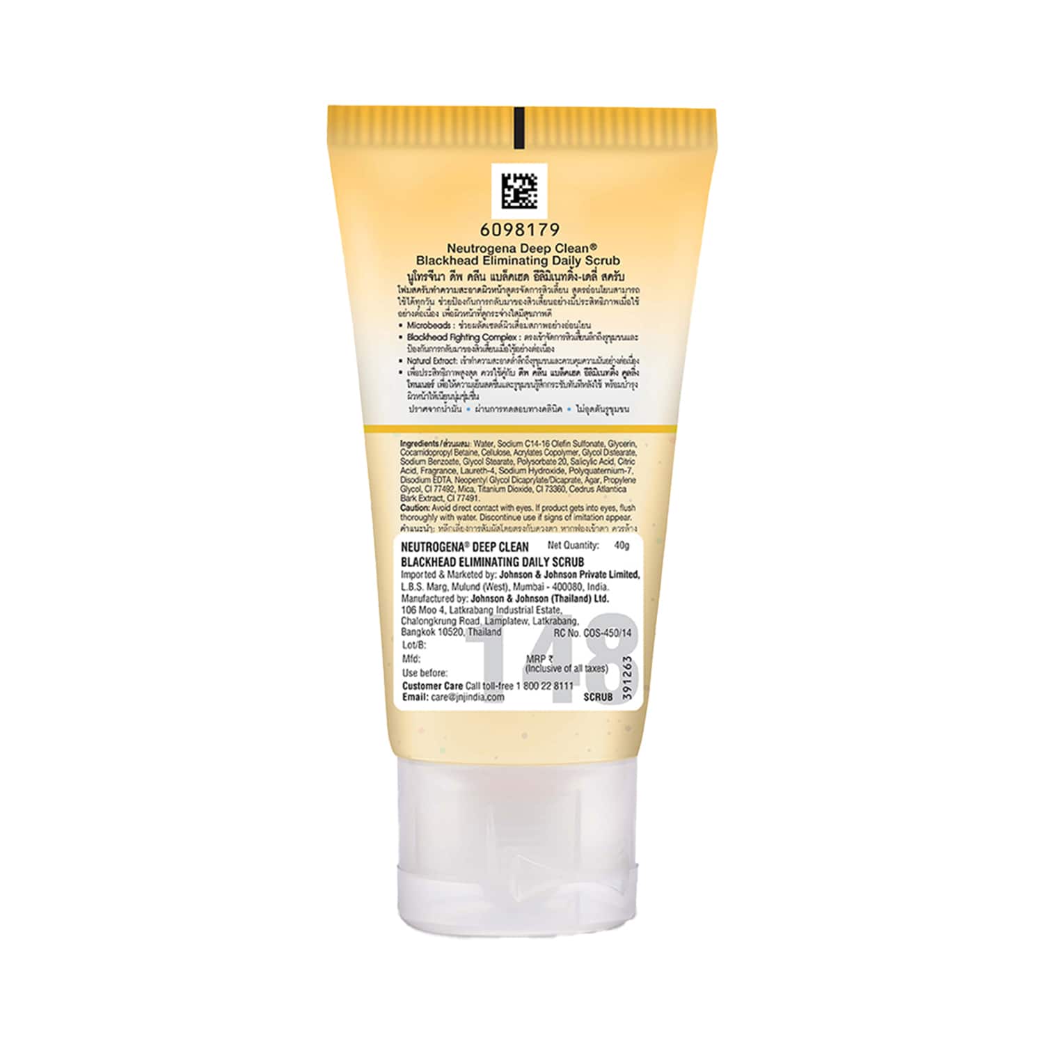 Get healthy-looking skin with the Neutrogena Deep Clean Blackhead Eliminiting Scrub - (40g). This daily face scrub effectively reduces blackheads and prevents new ones from forming with continued use, leading to clear skin. In addition, the Neutrogena deep clean scrub contains natural ingredients to control excess oil production.Key Features & Benefits:Infused with microbeads for keeping pores cleanExfoliating scrub removes dead skin cellsOil-free scrub eliminates blackheadsDermatologically tested for safe useHow to Use:Scoop a pea-sized amount and apply it on wet skin. Exfoliate gently in a circular motion with upward and outward strokes. Continue for 5 minutes. Rinse with cold water or wipe off with a damp towel. Follow up with a moisturiser for an effective result.All Ingredients:Water, Cetyl Alcohol, Titanium Dioxide, Ppg 15 Stearl Ether, Polyethylene, Gluceth 20, Steareth 21, Stearath 2, Polysorbate 60, Glyceryl Oleate, Coco Glucoside, Linoleamidopropyl Pg Dimonium Chloride Phosphate, Neopentyl Glycol Dicarpylate, Menthol, Disodium Edta, Xanthan Gum, Potassium Cetyl Phosphate, Agar, Mica, Iron Dioxide, Red 30 Lake And FragranceAbout the Brand:Neutrogena is a company that's been around since 1930. It started out as a beauty brand based in the United States, but it quickly grew to be one of the most trusted names in skincare and beauty products. Neutrogena believes that healthy skin is the key to beautiful skin, and they continue to innovate their products to help people achieve that goal. Their consumer insights inspire product innovations, which means that their products never go out of style or become obsolete. They also don't follow past trends-they stay true to their values by creating innovative products that are both effective and affordable for everyone.Check out more Neutrogena Body Scrubs & Exfoliants options here, or browse through tokocart's full range of Body Scrubs & Exfoliants from top global brands.You can also explore other products from the world of Neutrogena here on tokocart.