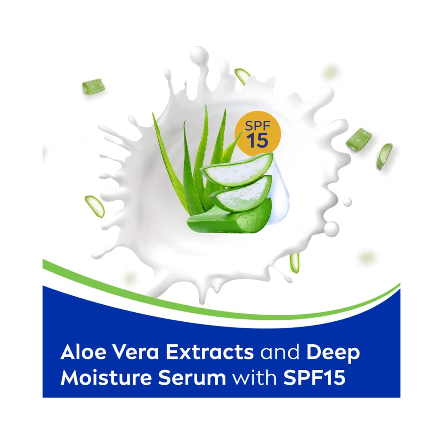 Elevate your skincare routine with the Nivea Aloe Protection Body Lotion SPF 15 (200ml). This aloe vera body lotion locks moisture into the skin and provides deep hydration for up to 48 hours. Also, this Nivea body lotion is a sun protection body lotion with SPF 15 that helps to prevent sun damage. Plus, this moisturizing lotion makes the skin soft and smooth.