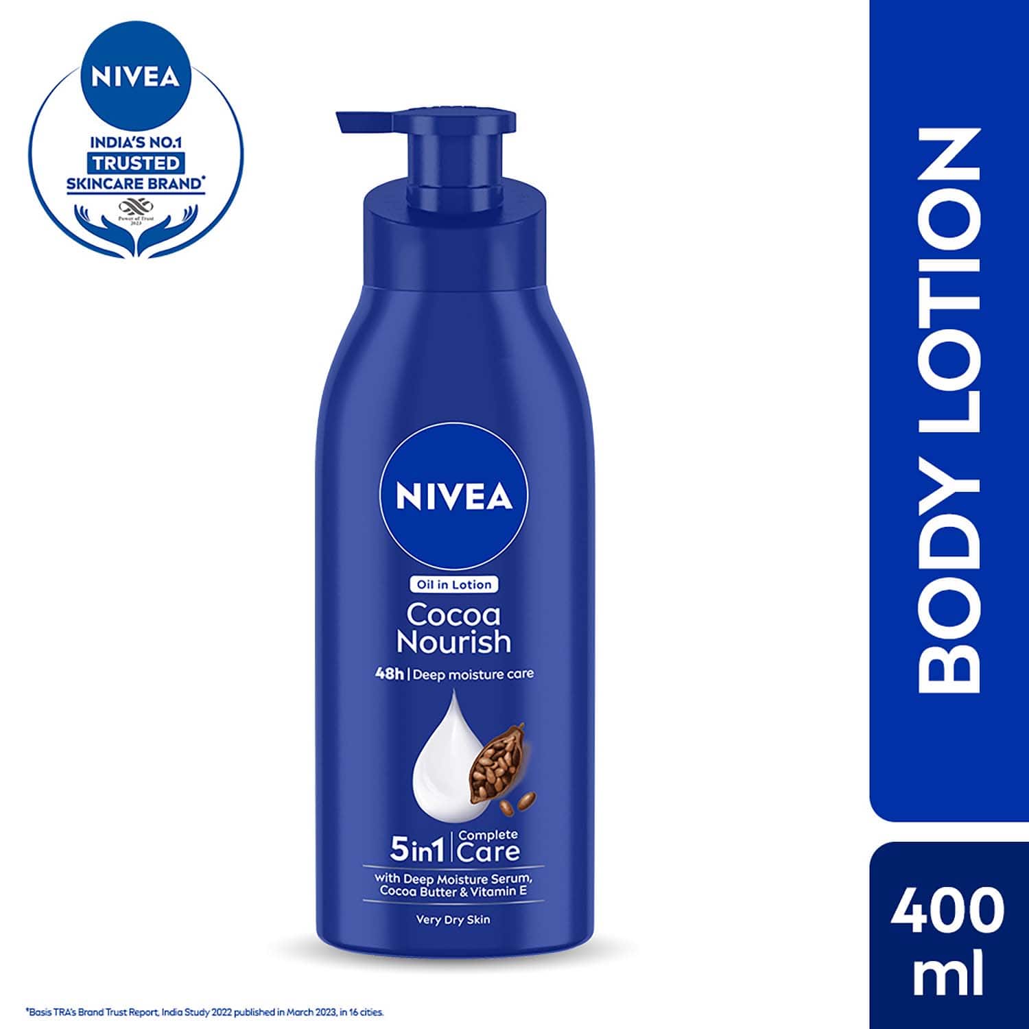 Upgrade your skincare routine with the Nivea Cocoa Nourish Oil In Lotion Body Lotion - (400ml). It is infused with cocoa butter and coconut oil to give you soft and moisturized skin after every use. This creamy body lotion contains deep moisture serum that absorbs quickly to prolong skin hydration for upto 48 hours. Dermatologically tested, this Nivea body lotion also features a beautiful fragrance that invigorates your senses.Key Features & Benefits:Repairing body lotion contains cocoa butter and coconut oilFeatures deep moisture serum for 48-hour moisturizationPleasant fragrance pleases sensesBest suited for extremely dry skinKey Ingredients:Cocoa butter: Nourishes and hydrates skinCoconut oil: Moisturizes skinHow to Use:Take an adequate amount of body lotion and evenly put it all over your body. Then, massage gently until absorbed. Apply twice daily for the best results.All Ingredients:Aqua, Glycerin, Cetearyl Alcohol, Isohexadecane, Isopropyl Palmitate, Paraffinum Liquidum, Glyceryl Stearate Se, Butyrospermum Parkii Butter, Dimethicone, Glyceryl Stearate, Theobroma Cacao Seed Butter, Cocos Nucifera Oil, Tocopheryl Acetate, Glyceryl Glucoside, Carbomer, Sodium Cetearyl Sulfate, Trisodium Edta, Ethylparaben, Methylparaben, Phenoxyethanol, Sodium Hydroxide, ParfumAbout the Brand:Founded in 1911, Nivea started its journey from Nivea creme, its first product launch. With more than 130 years of experience, Nivea is a widespread German personal care brand specializing in skin and body care. This German brand dominates the Indian skin care market under the name Nivea India Pvt. Ltd. The brand offers skincare solutions for men and women. They have a wide range of products to serve different segments of the skincare market. Nivea has also established a brand with hardcore values ??that are uncompromising no matter what. The brand is known for not using animal fats in its products. Nivea strives to use safe, healthy, and environmentally-friendly ingredients for their offerings with a 'skin comes first'-approach.Check out more Nivea Body Lotions & Moisturisers options here, or browse through tokocart's full range of Body Lotions & Moisturisers from top global brands.You can also explore other products from the world of Nivea here on tokocart.