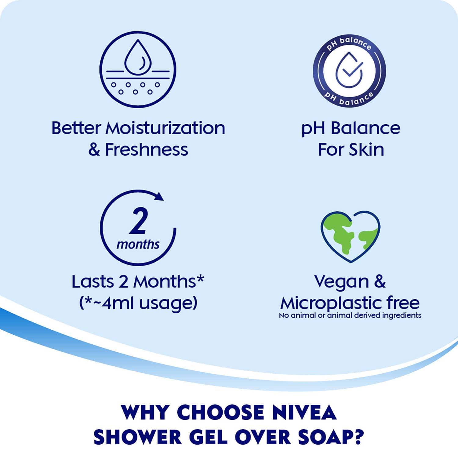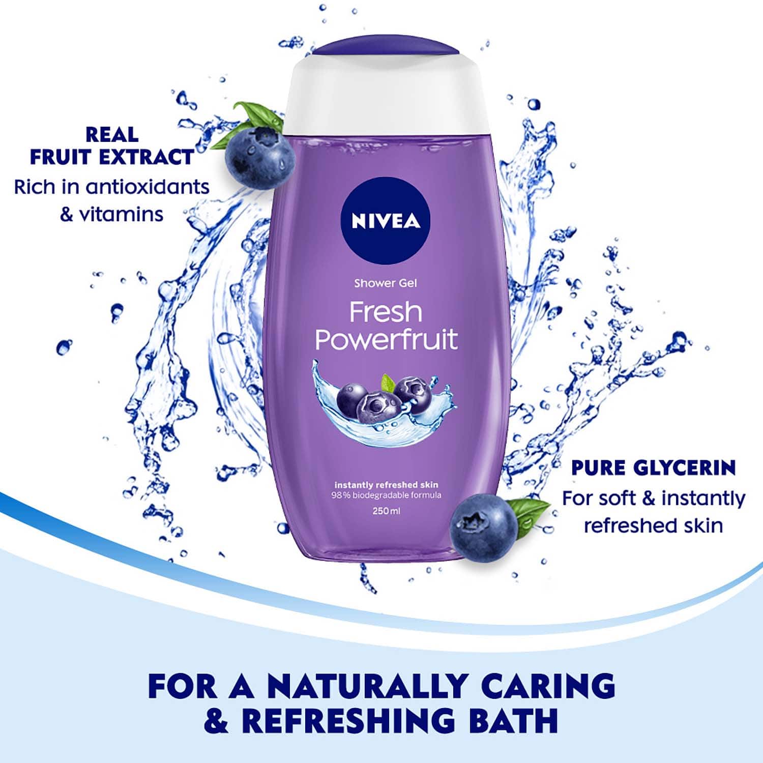 Care for your skin with the Nivea Power Fruit Fresh Body Wash And Shower Gel - (250ml). This revitalizing body wash with antioxidants envelops the skin in silky soft lather and invigorates the senses with the blueberry scent. The Nivea shower gel also has a caring formula that moisturizes your skin without drying after wash.Key Features & Benefits:Enriched with hydra IQ for intense hydration of your skinCleansing body wash provides deep cleansing of your skinNourishing shower gel maintains the pH balance of your skinBlueberry scent gives a refreshing feelDermatologically tested shower gel for safe use on skinKey Ingredients:Aloe vera: Keeps your skin hydratedHow to Use:To start, pour the body wash on a wet loofah. After that, squeeze the loofah to create a lather and massage it on your damp skin. Then, rinse off the body wash with water and towel dry your body to get soft and fragrant skin.All Ingredients:Aqua, Sodium Laureth Sulfate, Cocamidopropyl Betaine, Peg-7 Glyceryl Cocoate, Parfum, Glycerin, Glyceryl Glucoside, Sodium Ascorbyl Phosphate, Vaccinium Myrtillus Fruit Extract, Sodium Chloride, Peg-40 Hydrogenated Castor Oil, Polyquaternium-7, Citric Acid, Peg-200 Hydrogenated Glyceryl Palmate, Benzophenone-4, Sodium Benzoate, Benzoic Acid, Linalool, Geraniol, Citronellol, Ci 16035, Ci 42090.About the Brand:Founded in 1911, Nivea started its journey from Nivea creme, its first product launch. With more than 130 years of experience, Nivea is a widespread German personal care brand specializing in skin and body care. This German brand dominates the Indian skin care market under the name Nivea India Pvt. Ltd. The brand offers skincare solutions for men and women. They have a wide range of products to serve different segments of the skincare market. Nivea has also established a brand with hardcore values ??that are uncompromising no matter what. The brand is known for not using animal fats in its products. Nivea strives to use safe, healthy, and environmentally-friendly ingredients for their offerings with a 'skin comes first'-approach.