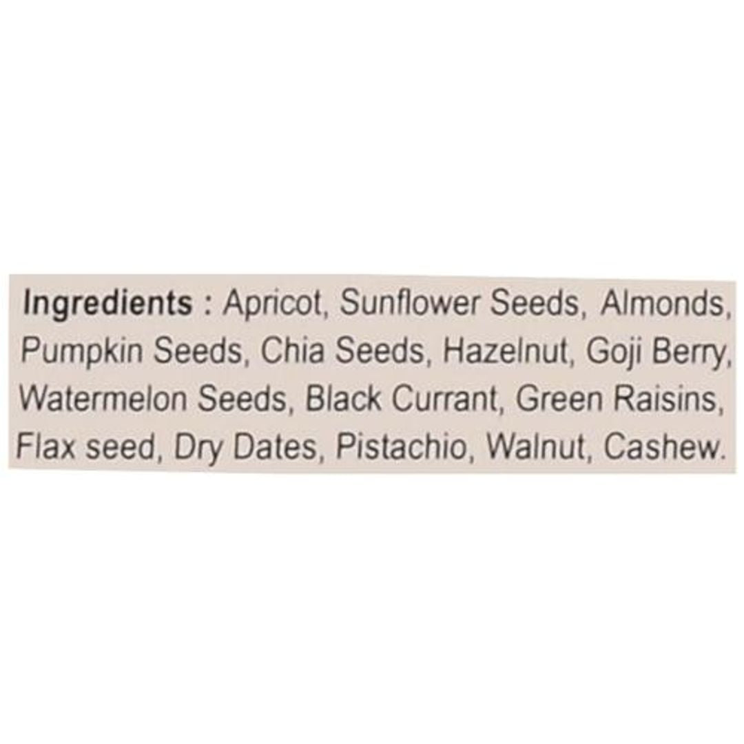 Apricot, Sunflower Seeds, Almonds, Pumpkin Seeds, Chia Seeds, Hazelnut, Goji Berry, Watermelon Seeds, Black Currant, Green Raisins, Flax seed, Dry Dates, Pistachio, Walnut, Cashew nut.