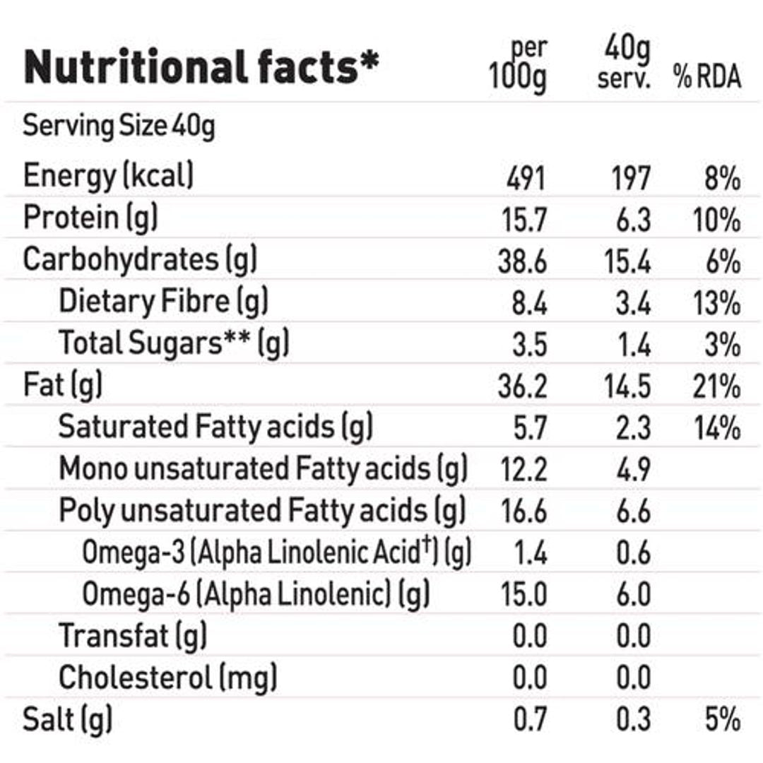 Serving Size 40g-energy(kcal) -197, Protein (g) 6.1, Carb (g) 15.4, Dietary Fibre(g) 3.4, Sugar 1.4g, Fat (g) 14.5, Mufa (g) 4.9, Pufa(g) 6.6, Saturated Fatty Acid (g) 2.3, Omega3 -600mg, Omega 6-5.8g, Trasfat (g) - 0, Cholestrol(g) -0. Salt(g) -0.3