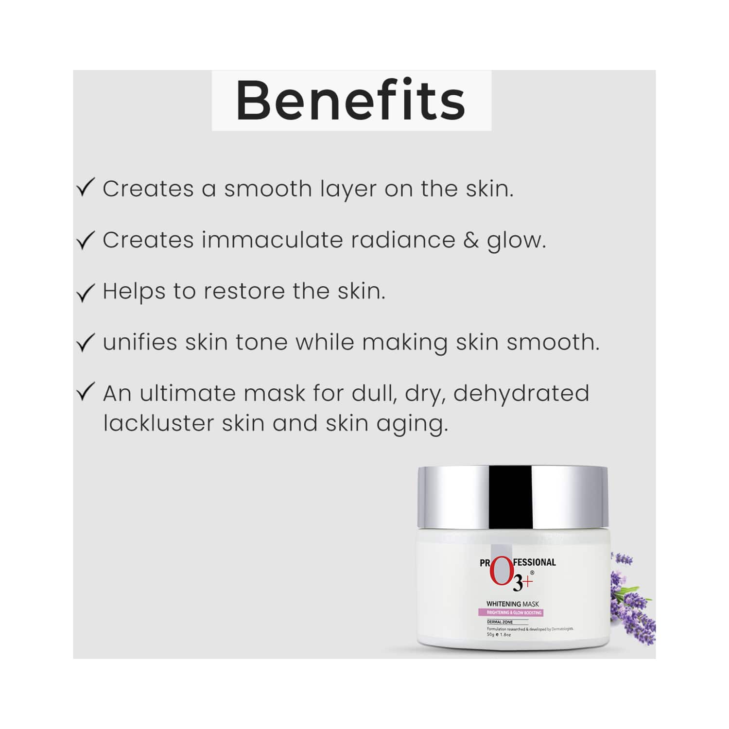 Treat your skin with the goodness of the O3+ Dermal Zone Brightening & Whitening Mask (50g). This vitamin C face mask nourishes the skin and has a tan-removal formula. It is a soothing mask that calms irritated and inflamed skin. The O3+ face mask is also a brightening mask that reduces dark spots and blemishes.