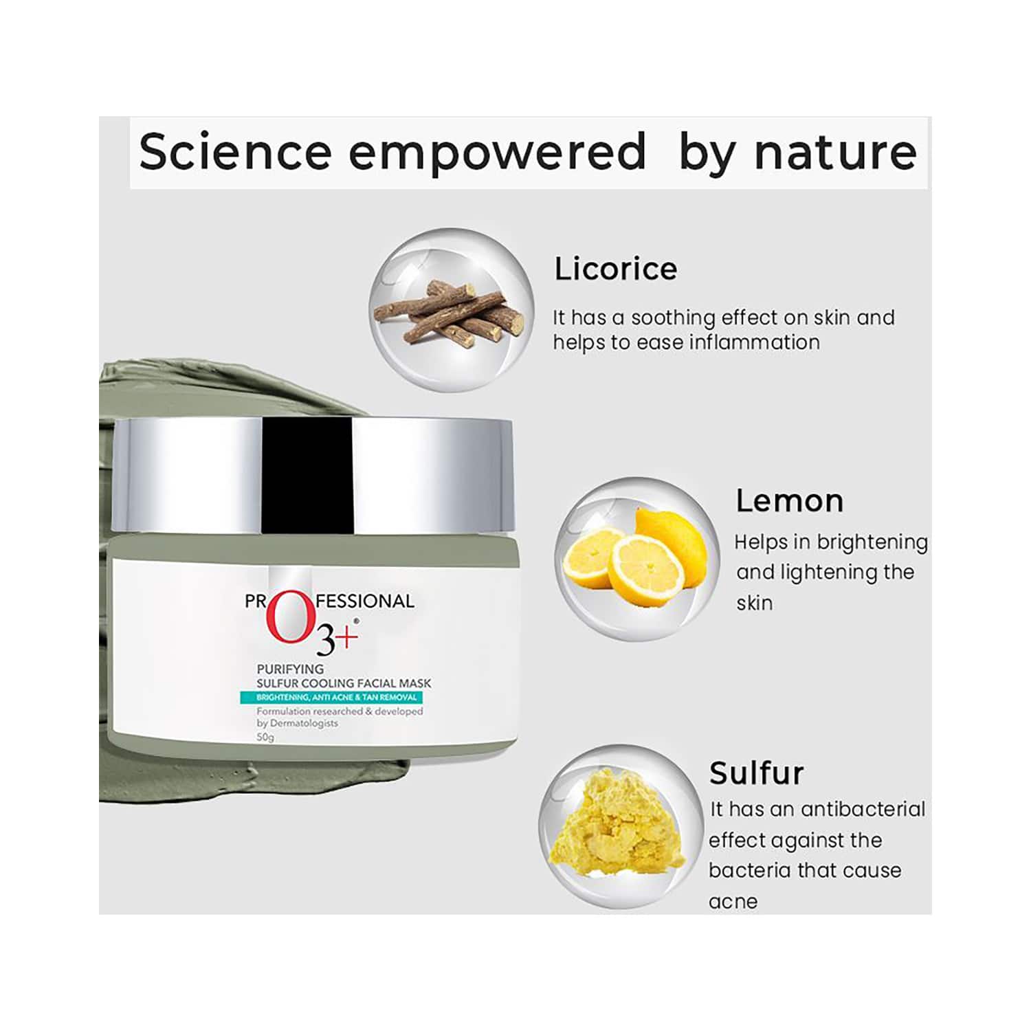 Now get a total skin makeover. Enriched with organic willow bark and mint, O3+ Purifying Sulfur Cooling Facial Mask refreshes the skin by digesting dead unhealthy cells and preventing pore clogging. It prevents future acne breakouts and reduces the appearance of acne marks while controlling the excess oil production. It is natural, fast acting, anti-septic & anti-bacterial product. Also has the properties of calming and soothing the skin. O3+ Sulfur cooling mask gently cleanses your skin to the core and brings out a radiant glow.Key Features & Benefits:Enriched with 100% natural ingredients like organic willow bark and mint