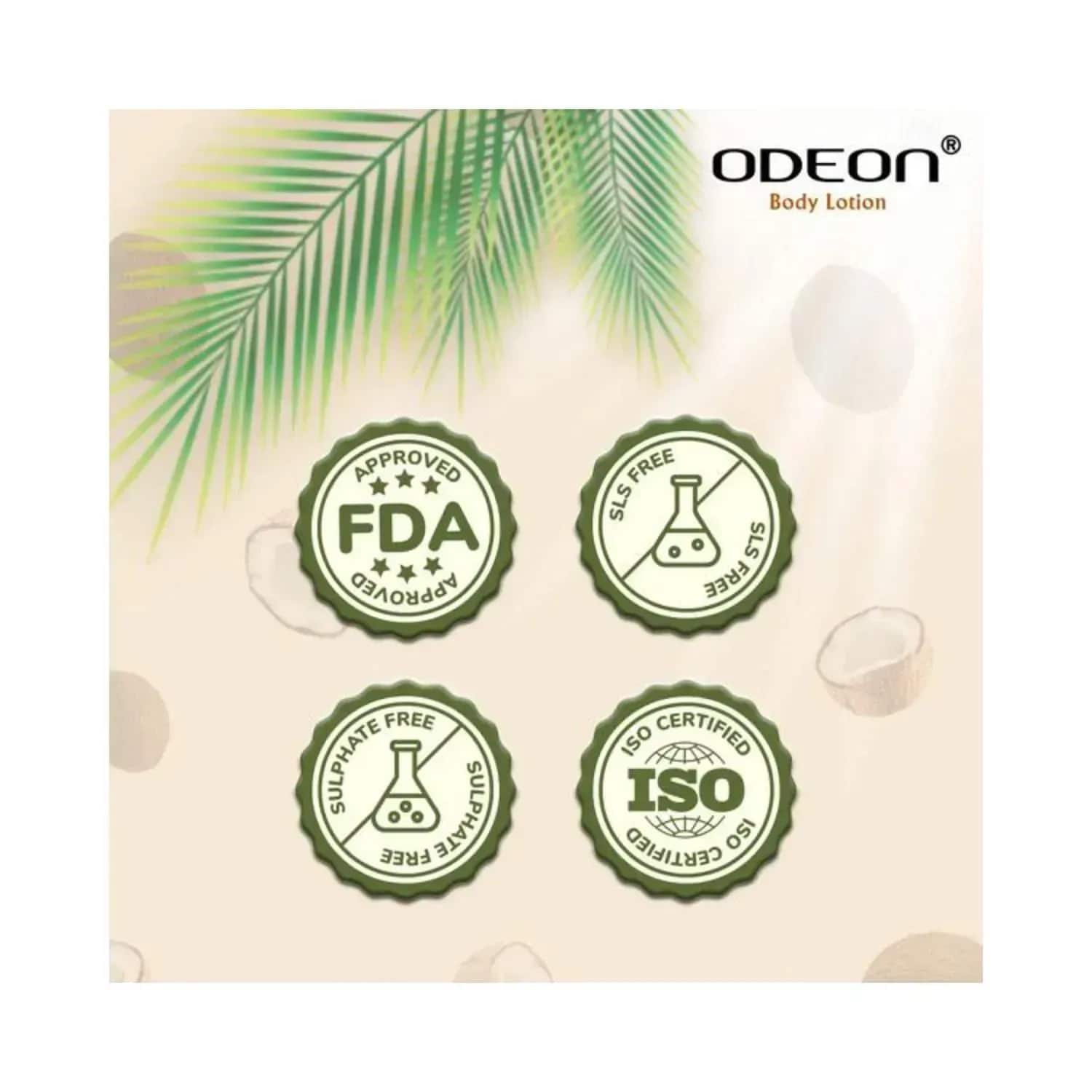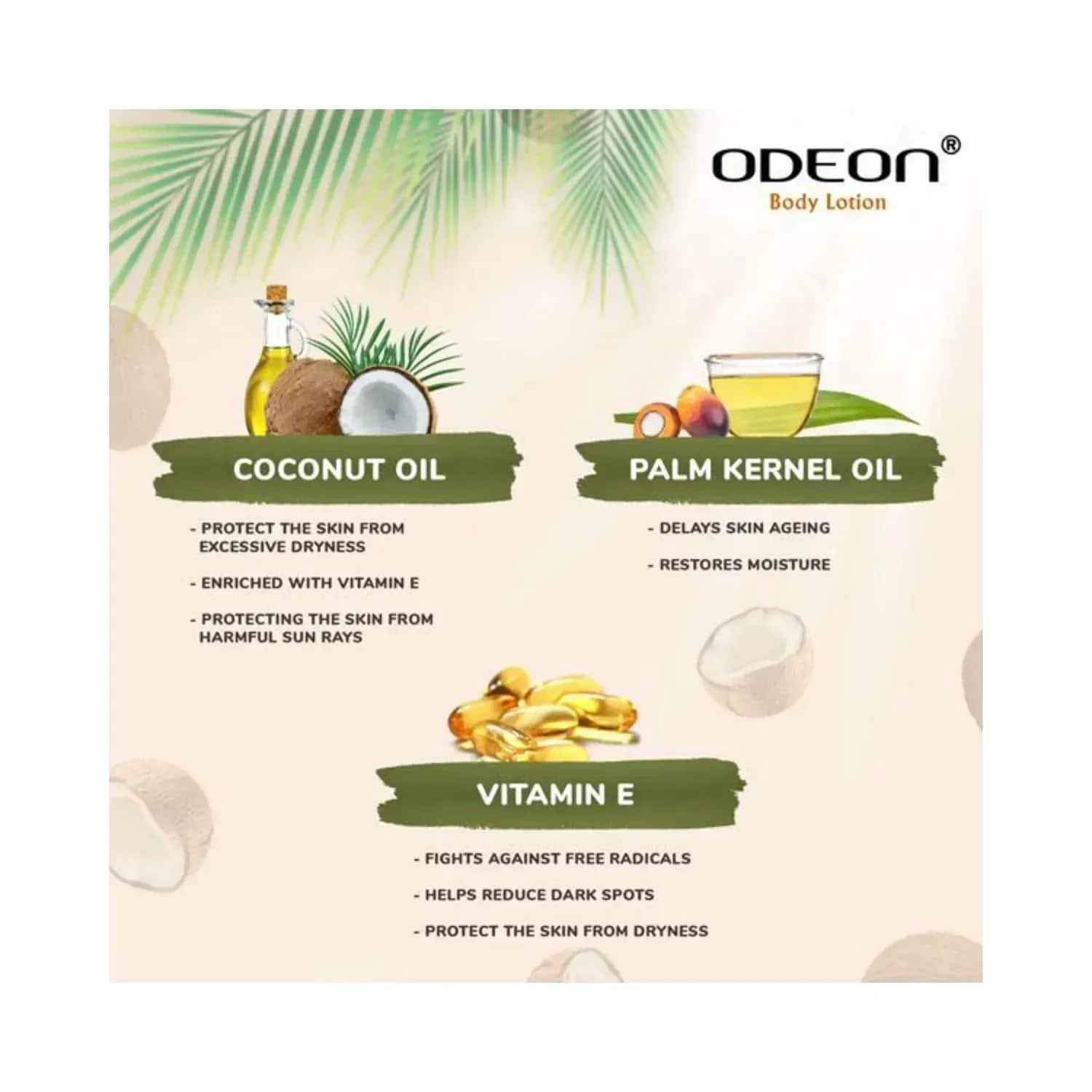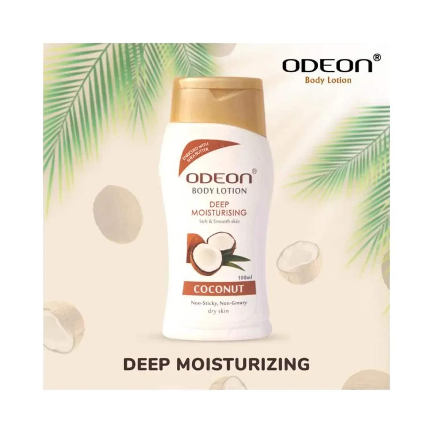 Nourish your skin with the Odeon Deep Moisturising Coconut Body Lotion - (100ml). This Odeon body lotion is infused with coconut oil which moisturises dry skin and protects it from damage. In addition, this coconut body lotion is enriched with vitamin E and palm kernel oil, which prevents premature ageing and provides radiant skin.Key Features & Benefits:Infused with coconut oil to nourish damaged skinDeep-moisturising body lotion has vitamin E and palm kernel oil to reduce premature ageing and restoring skin elasticityNatural and vegan body lotion to make your skin soft and smoothChemical-free body lotion for safe useKey Ingredients:Coconut oil: Deeply Moisturiser and softens the skinPalm kernel oil: Restores skin elasticityVitamin E: Reduces premature ageingHow to Use:Wash your skin. Take a bit of the lotion and put it on your skin. After that, massage well for increased hydration. Apply twice daily for the best results.All Ingredients:Shea ButterAbout the Brand:Established in 1989 in Kolkata, Odeon Cosmetics Pvt. Ltd. is a vegan beauty, cosmetic, and personal care brand. The brand brings its extensive range of globally recognised and researched products. Their main focus is to produce a range of hair care and skincare products that are backed up by extensive research and made with natural do-good ingredients to offer "real care" and "real value" to their consumers. Additionally, their products are FDA-approved, 100% silicone-free, and backed by years of research and development.Check out more ODEON Body Lotions & Moisturisers options here, or browse through tokocart's full range of Body Lotions & Moisturisers from top global brands.You can also explore other products from the world of ODEON here on tokocart.