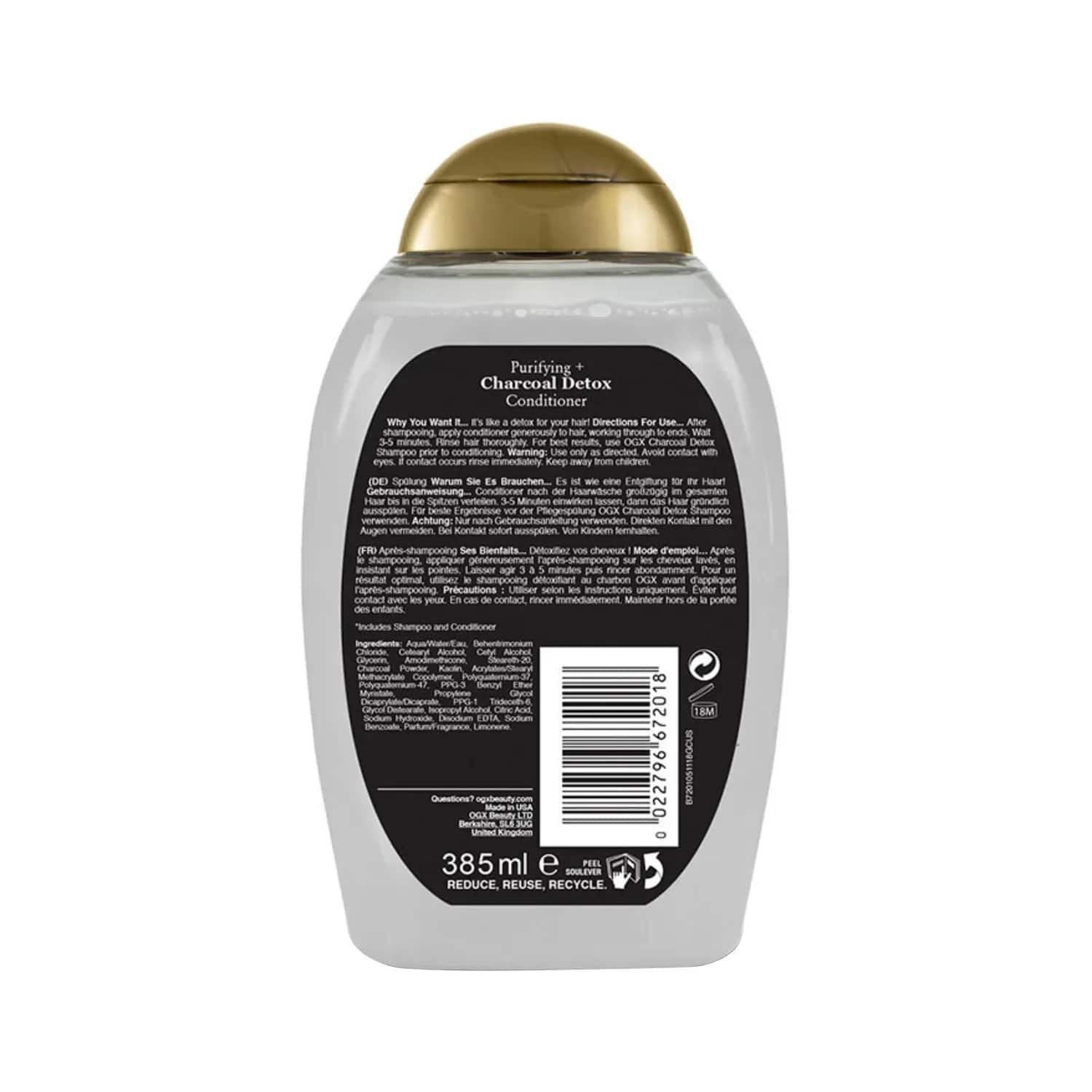 Get rid of dry hair with the Ogx Purifying Charcoal Detox Conditioner - (385ml). This charcoal conditioner is formulated with coconut-activated charcoal and kaolin clay that helps eliminate buildup without revealing clean strands for a balanced shine. The OGX detox conditioner rescues dull and damaged tresses, providing shiny hair.Key Features & Benefits:Enriched with egg white protein to provide silky smooth locksHair strengthening conditioner provides strong hairMoisturizing conditioner hydrates your tressesFree from parabens and sulfates for safe useKey Ingredients:Charcoal: Purifies your hairKaolin clay: Removes buildup from hairHow to Use:Shampoo your hair and rinse off well. Apply a small amount of conditioner to your scalp and hair strands. Leave it for 1 minute and rinse well for softer and bouncier hair.All Ingredients:Water (Aqua), Cetearyl Alcohol, Cetyl Alcohol, Behentrimonium Chloride, Glycerin, Amodimethicone, Steareth-20, Charcoal Powder, Kaolin, Ppg-3 Benzyl Ether Myristate, Polyquaternium-47, Polyquaternium-37, Glycol Distearate, Propylene Glycol Dicaprylate/Dicaprate, Ppg-1 Trideceth-6, Isopropyl Alcohol, Citric Acid, Sodium Hydroxide, Disodium Edta, Sodium Benzoate, Fragrance (Parfum).About the Brand:Founded in 1987 in OGX, Clearwater, Florida, the company personalizes for everyone a variety of salon-inspired shampoos and conditioners that cleanse the scalp and work with all hairstyles. OGX is a premium hair care brand, constantly creating new products with different ingredients and designs. In addition, each OGX product, which emits a pleasant scent of exotic materials, is composed of three sensual fragrances, top, middle, and base notes, respecting the order of scents so that the colorful scent lasts for a long time. With a special combination of argan oil, coconut water, and cherry blossom, OGX's diverse product line brings your hair to life for healthy, beautiful hair.Check out more OGX Conditioner options here, or browse through tokocart's full range of Conditioner from top global brands.You can also explore other products from the world of OGX here on tokocart.