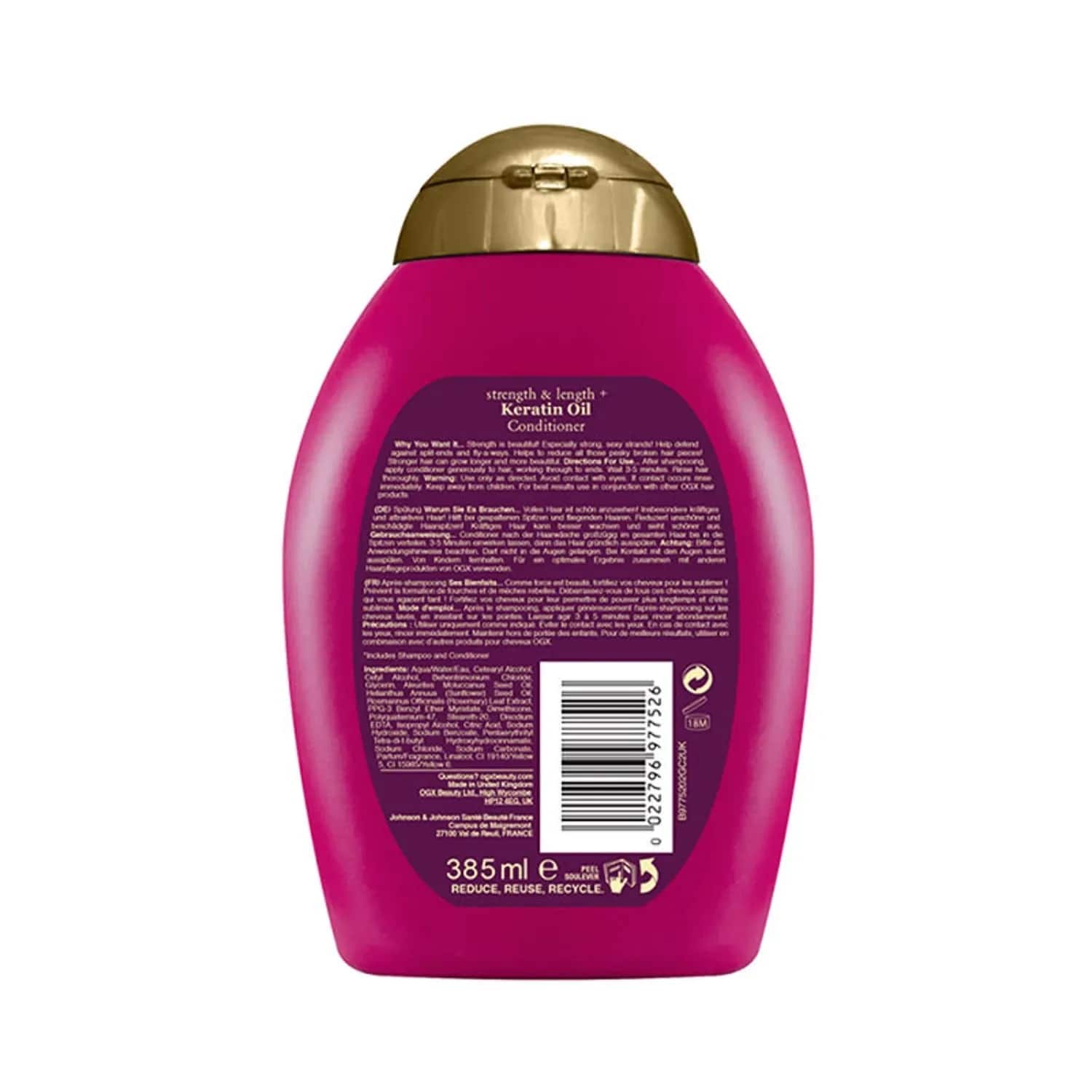 Get long and strong hair with the Ogx Strength & Length Keratin Oil Conditioner - (385ml). This keratin oil conditioner is enriched with argan oil that increases hair strength, prevents hair loss due to breakage, and leads to stronger hair. The OGX strengthening conditioner also provides hydration to your hair.Key Features & Benefits:Enriched with keratin protein to reduce hair breakageHair smoothing conditioner with argan oil reduces split endsMoisturizing conditioner provides nourished hairFree from parabens and sulfates for safe useKey Ingredients:Argan oil: Provides silky hairKeratin protein: Controls hair fall due to breakageHow to Use:Shampoo your hair and rinse off well. Apply a small amount of conditioner to your scalp and hair strands. Leave it for 1 minute and rinse well for softer and bouncier hair.All Ingredients:Water (Aqua), Cetearyl Alcohol, Cyclopentasiloxane, Dimethicone, Behentrimonium Chloride, Cetyl Alcohol, Hydrolyzed Keratin, Argania Spinosa (Argan) Kernel Oil, Dimethiconol, Polyquaternium-37, Propylene Glycol Dicaprylate/Dicaprate, Ppg-1 Trideceth-6, Isopropyl Alcohol, Citric Acid, Dmdm Hydantoin, Methylchloroisothiazolinone, Methylisothiazolinone, Magnesium Chloride, Magnesium Nitrate, Fragrance (Parfum), Yellow 5 (Ci 19140), Yellow 6 (Ci 15895), Blue 1 (Ci 42090).About the Brand:Founded in 1987 in OGX, Clearwater, Florida, the company personalizes for everyone a variety of salon-inspired shampoos and conditioners that cleanse the scalp and work with all hairstyles. OGX is a premium hair care brand, constantly creating new products with different ingredients and designs. In addition, each OGX product, which emits a pleasant scent of exotic materials, is composed of three sensual fragrances, top, middle, and base notes, respecting the order of scents so that the colorful scent lasts for a long time. With a special combination of argan oil, coconut water, and cherry blossom, OGX's diverse product line brings your hair to life for healthy, beautiful hair.Check out more OGX Conditioner options here, or browse through tokocart's full range of Conditioner from top global brands.You can also explore other products from the world of OGX here on tokocart.