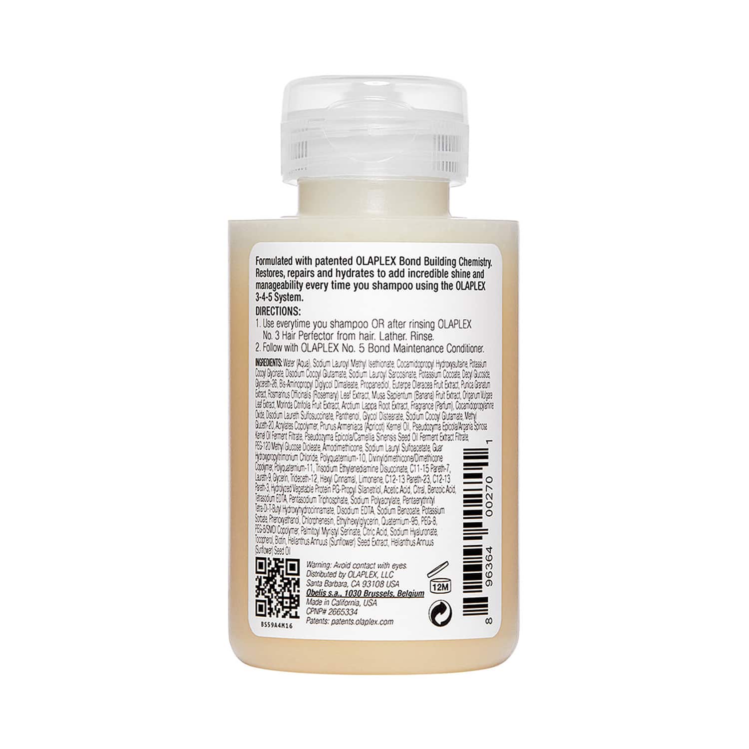 Tired of your lackluster hair that breaks easily? Switch to the Olaplex No. 4 Bond Maintenance Shampoo (100ml). This nourishing shampoo cleanses the scalp and locks moisture in the hair. It is an anti-frizz shampoo that reduces hair breakage and split ends. The Olaplex shampoo is also a hair-strengthening cleanser that provides strong hair roots.Key Features & Benefits:Helps to reduce breakage and provides manageable hairPurifying hair cleanser cleanses the scalpHydrating shampoo nourishes the hair shaftFree from gluten, paraben, nut, and sulfate for safe useAll Ingredients:Water (Aqua), Sodium Lauroyl Methyl Isethionate, Cocamidopropyl Hydroxysultaine, Potassium Cocoyl Glycinate, Disodium Cocoyl Glutamate, Sodium Lauroyl Sarcosinate, Potassium Cocoate, Decyl Glucoside, Glycereth-26, Phenoxyethanol, Fragrance (Parfum), Cocamidopropylamine Oxide, Disodium Laureth Sulfosuccinate, Glycol Distearate, Sodium Cocoyl Glutamate, Methyl Gluceth-20 Acrylates Copolymer, Peg-120 Methyl Glucose Dioleate, Amodimethicone, Citric Acid Sodium Lauryl Sulfoacetate, Polyquaternium-10, Ethylhexylglycerin, Chlorphenesin, Divinyldimethicone/Dimethicone Copolymer, Guar Hydroxypropyltrimonium Chloride, Polyquaternium-11, Trisodium Ethylenediamine Disuccinate, C11-15 Pareth-7, Laureth-9, Glycerin, Trideceth-12, Hexyl Cinnamal, Limonene, C12-13 Pareth-23, C12-13 Pareth-3, Hydrolyzed Vegetable Protein Pg-Propyl Silanetriol, Panthenol, Acetic Acid, Citral, Benzoic Acid, Tetrasodium Edta, Pentasodium Triphosphate, Disodium Edta, Potassium Sorbate, Helianthus Annuus (Sunflower) Seed Oil, Tocopherol, Prunus Armeniaca (Apricot) Kernel Oil, Pseudozyma Epicola/Argania Spinosa Kernel Oil Ferment Filtrate, Pseudozyma Epicola/Camellia Sinensis Seed Oil Ferment Extract Filtrate, Quaternium-95, Propanediol, Helianthus Annuus (Sunflower) Seed Extract, Bis-Aminopropyl Diglycol Dimaleate Peg-8, Euterpe Oleracea Fruit Extract, Punica Granatum Extract, Rosmarinus Officinalis (Rosemary) Leaf Extract, Musa Sapientum (Banana) Fruit Extract, Origanum Vulgare Leaf Extract, Morinda Citrifolia Fruit Extract, Arctium Lap, Peg-8/Smdi Copolymer, Sodium Hyaluronate, Palmitoyl Myristyl Serinate, Sodium Polyacrylate, Pentaerythrityl Tetra-Di-T-Butyl Hydroxyhydrocinnamate, BiotinHow to Use:First, wet your hair thoroughly. Then, squeeze the required amount of shampoo on your palm and create a lather by rubbing your hands together. Next, apply the lathered shampoo on your scalp generously. Last, rinse your hair with water and follow by using a conditioner.About the Brand:Olaplex is one of the world's largest independent hair care brands, holding over 100 global patents. Olaplex produces damaged hair repair product developed by two chemists, Eric Presley and Craig Hawker, which is advertised as rebuilding broken bonds in hair caused by chemical, thermal, and mechanical damage. With a local approach, the brand quickly became a global sensation, paving the way for a whole new hair care category called “bond building.” The Olaplex collection contains a full line of products to help maintain that connection.