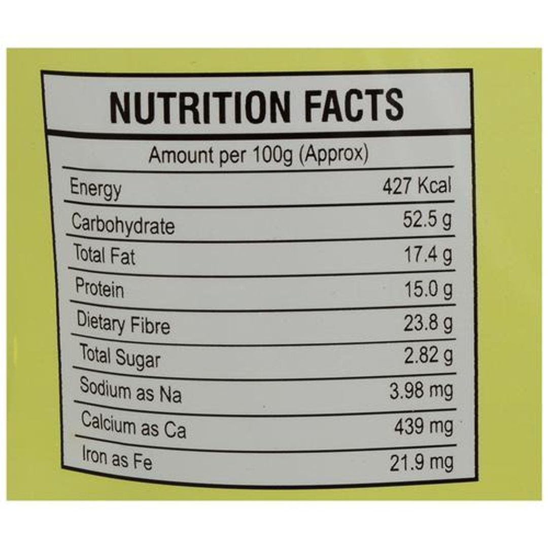 Per 100 :- Energy: 427Kcal, Carbohydrate: 52.5g, Total Fat: 17.4g, Protein: 15.0g, Dietary Fibre:23.8g, Total Sugar: 2.82g, Sodium:3.98mg, Calcium: 439mg, Iron: 21.9mg.