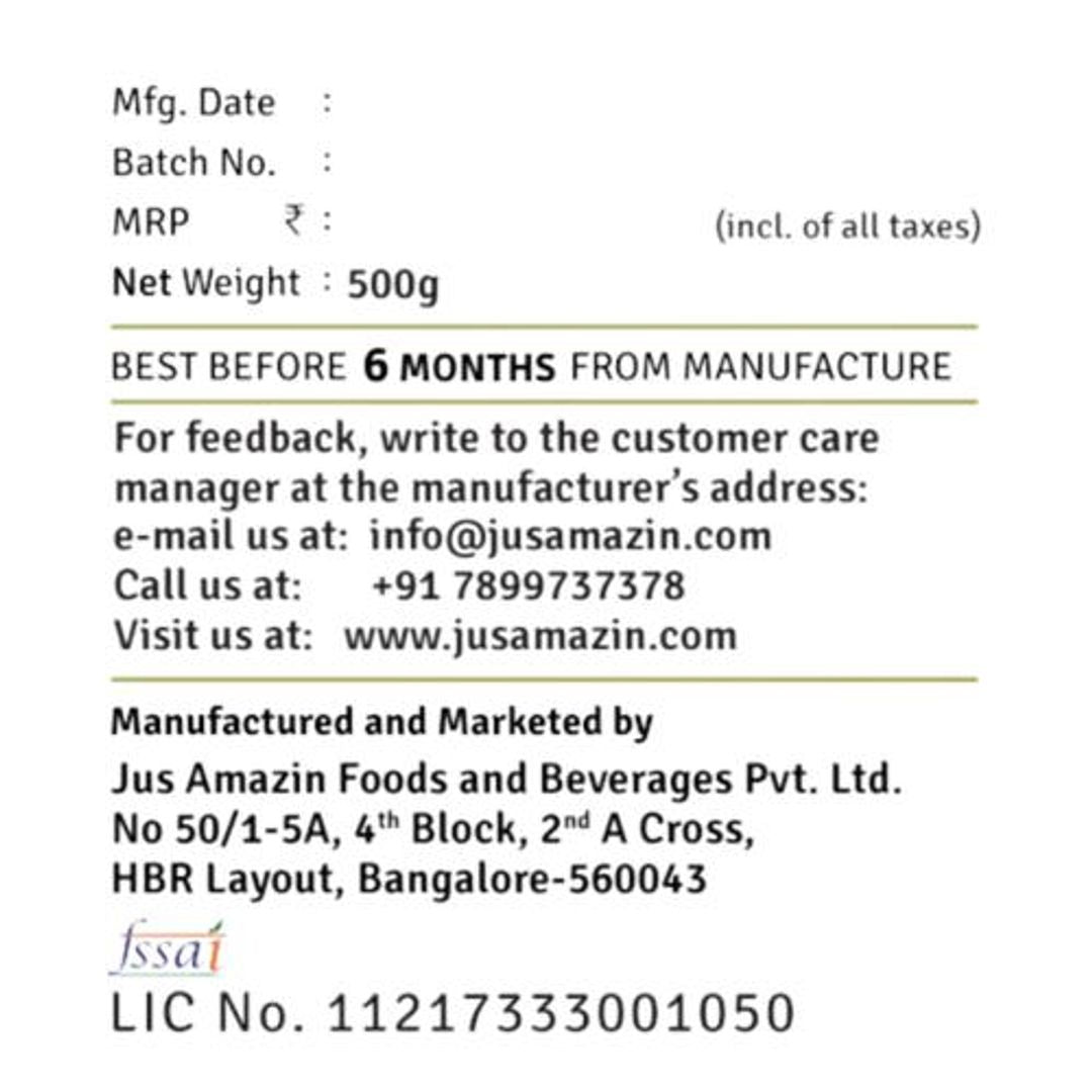 EAN Code: 40222635 FSSAI No: 1121733001050 Manufactured & Marketed by:Jus Amazin Foods and Beverages Pvt. Ltd., 50/1-5A, 4th Block, 2nd A Cross, HBR Layout, Bangalore - 560047 Country of origin: India Best before 10-05-2024 For Queries/Feedback/Complaints, Contact our Customer Care Executive at: Phone: 1860 123 1000 | Address: Innovative Retail Concepts Private Limited, Ranka Junction 4th Floor, Tin Factory bus stop. KR Puram, Bangalore - 560016 Email:customerservice@tokocart.com